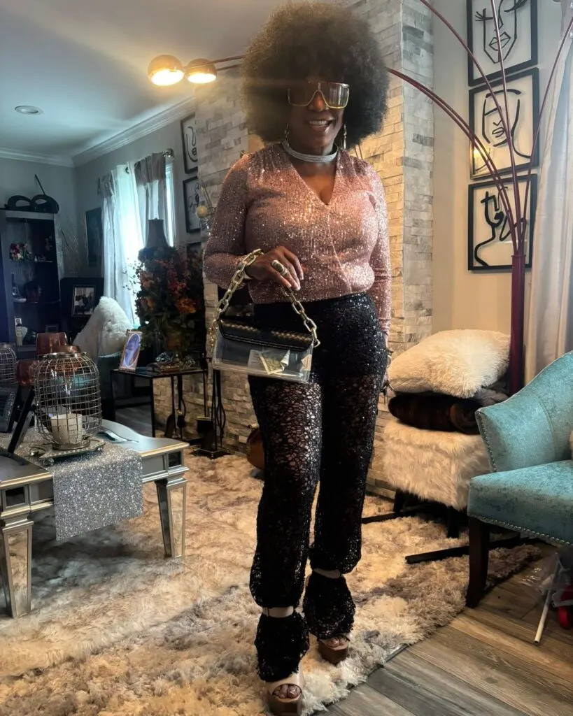 Its sleeveless cut keeps things light and playful, while the metallic fabric sparkles under the lights. Paired with a textured jacket for contrast, the outfit strikes the perfect balance between funky and fashion-forward. It’s bold, bright, and ready to light up any disco-inspired night.