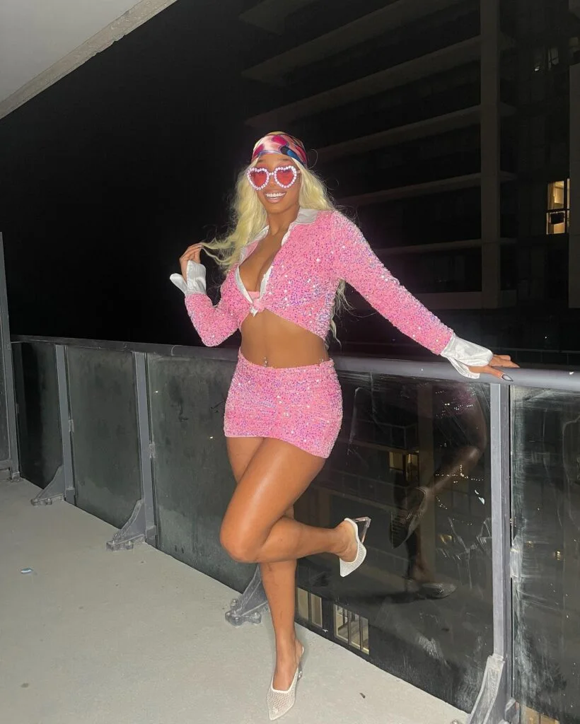 A bold pink belt at the waist adds a playful pop of color and defines the shape. Sparkly and figure-flattering, this outfit was made for twirling under a disco ball. It’s energetic, glamorous, and full of retro charm—ideal for owning the dance floor with confidence and flair.