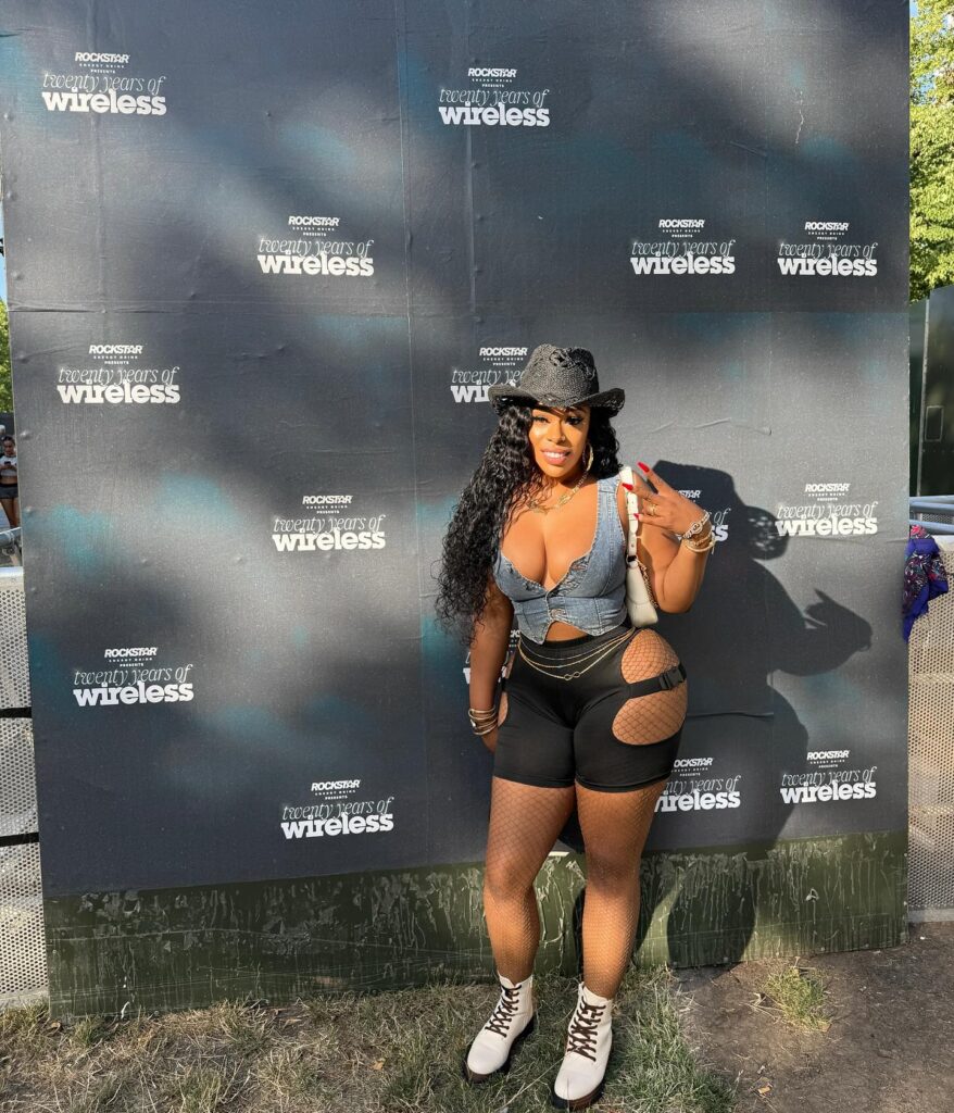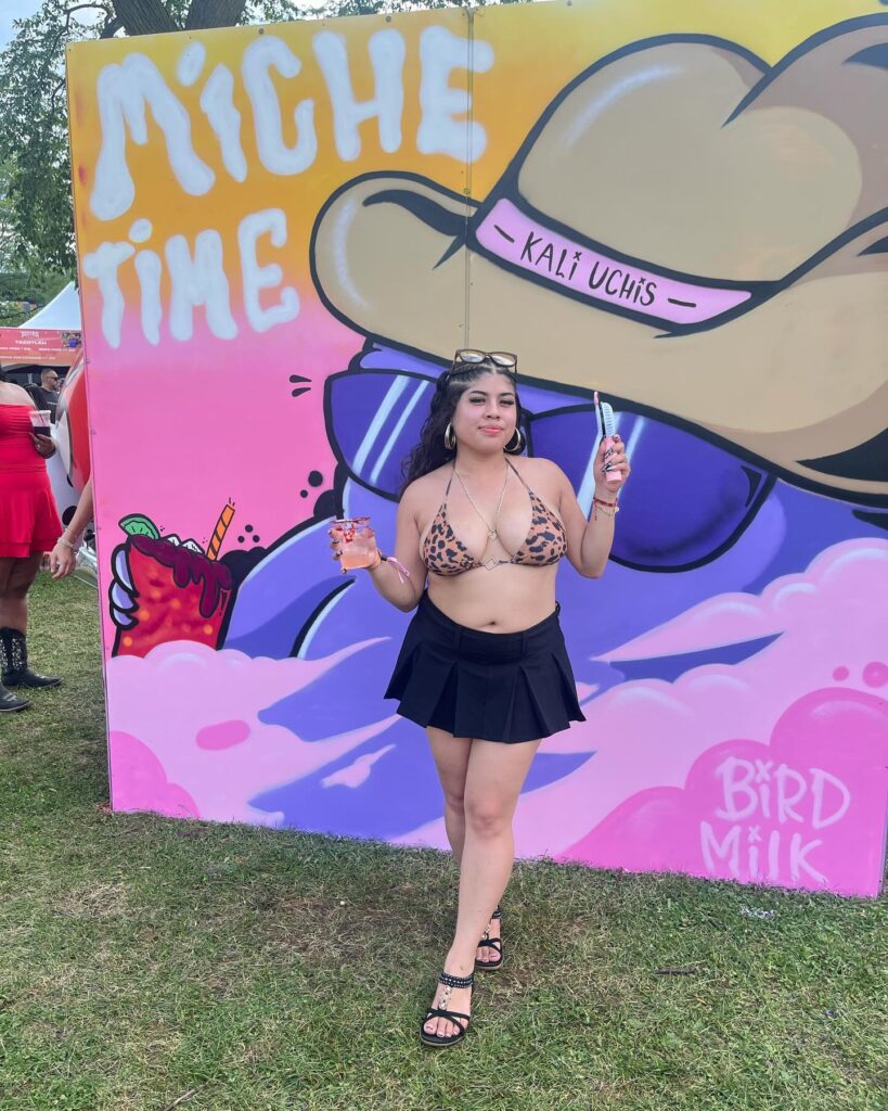 Strappy black sandals keep it comfy and cute while dancing all day. The outfit shows off confidence and personality, making it ideal for hot-weather concerts and outdoor events. It’s a fearless baddie vibe with effortless festival charm and a bold edge.