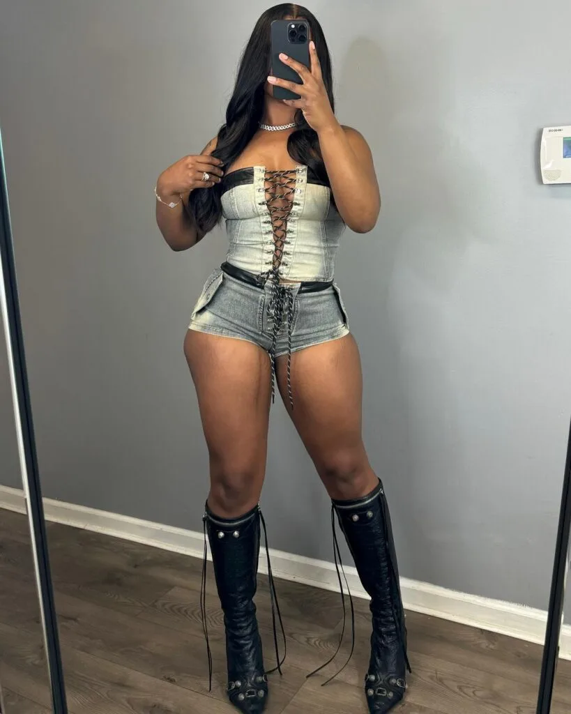This edgy concert outfit features a faded denim corset top with dramatic front lace-up detailing. It’s paired with matching high-cut denim shorts, creating a bold and figure-hugging silhouette.