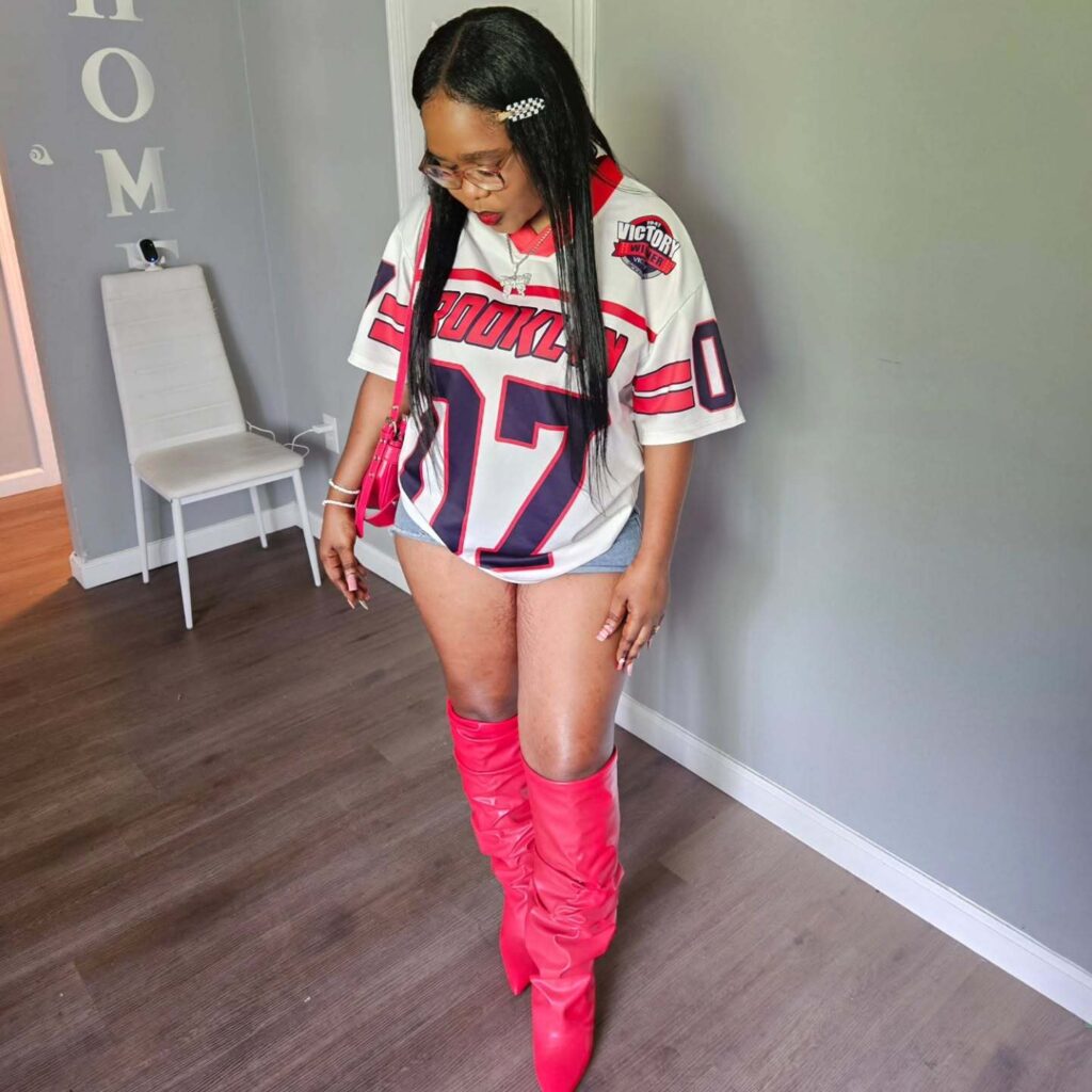 The standout piece is the pair of vibrant red slouchy thigh-high boots, adding a confident pop of color. It’s a perfect mix of casual and bold, ideal for concerts where comfort meets fearless style. This look brings major game-day energy with a strong baddie twist.