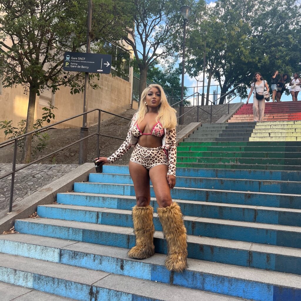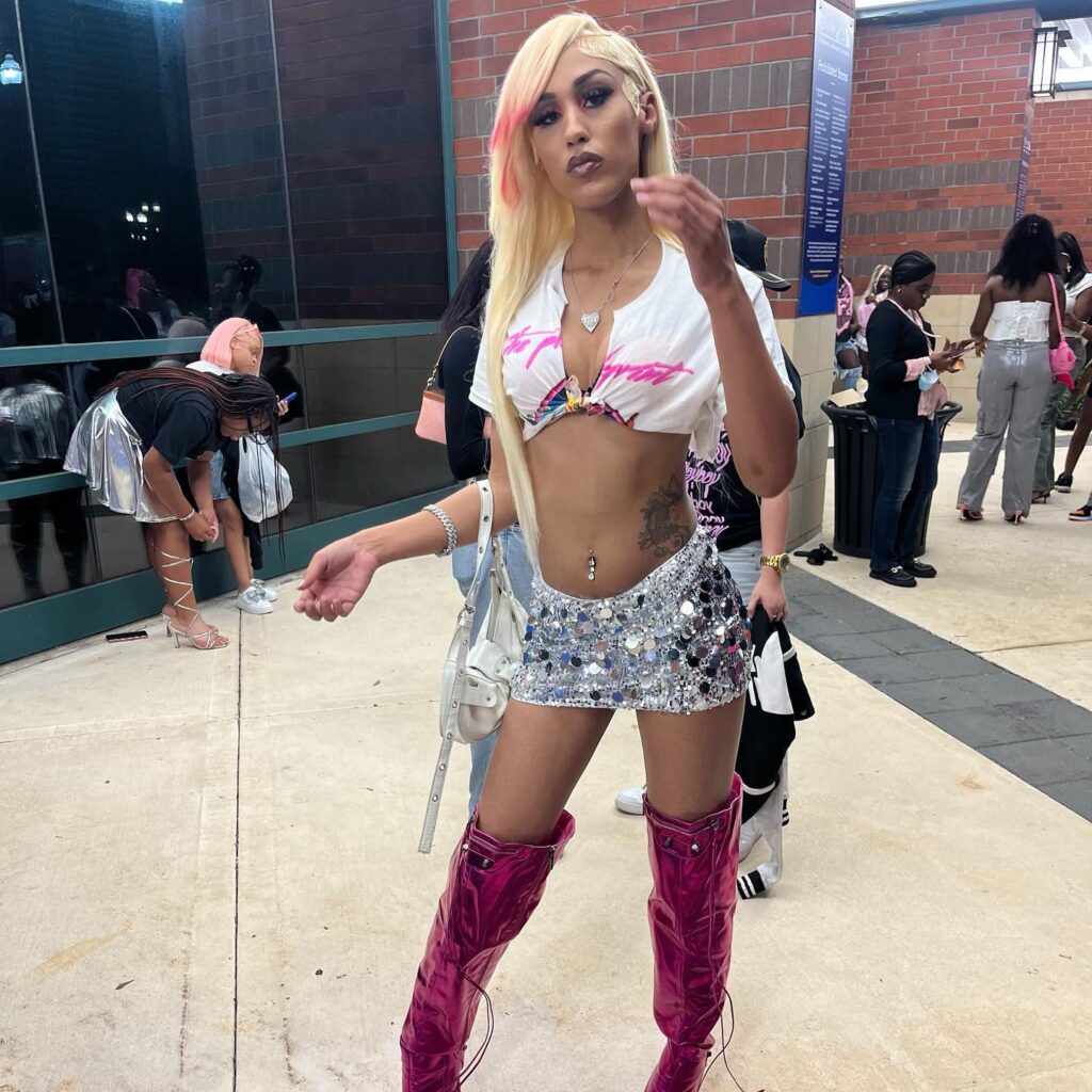 The fit hugs the body perfectly, offering a playful balance between sexy and street-ready. Finished with white sneakers and socks, it’s a comfy yet bold option for outdoor shows or day parties. This outfit delivers style with serious energy and attitude.