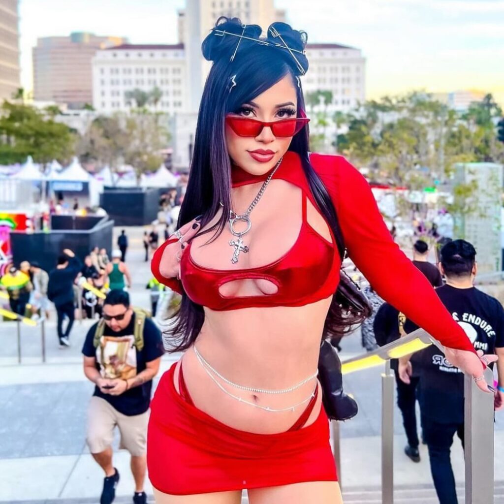 The edgy red sunglasses and statement necklace complete the vibe with a fierce finish. This fit is made for center stage moments at festivals or club shows. It’s daring, confident, and undeniably baddie with a futuristic twist.