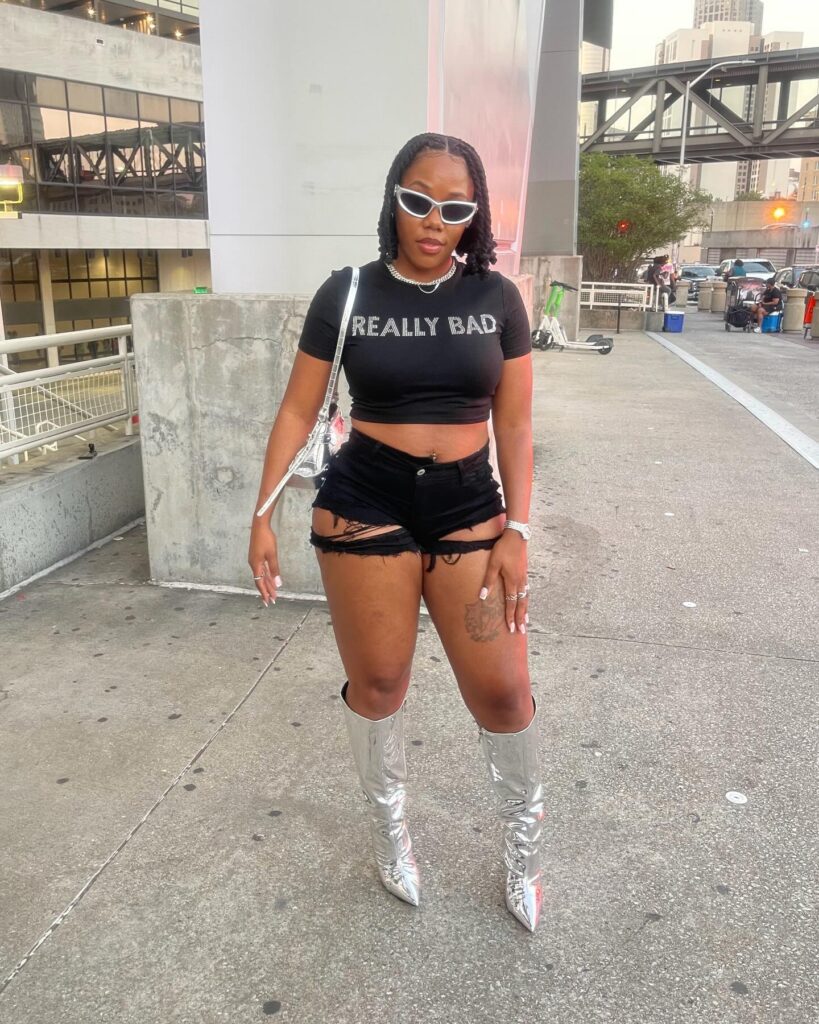 This edgy baddie look features a fitted black crop top with bold “REALLY BAD” lettering across the chest. It’s paired with distressed black cutout shorts that show just enough skin for a daring finish.