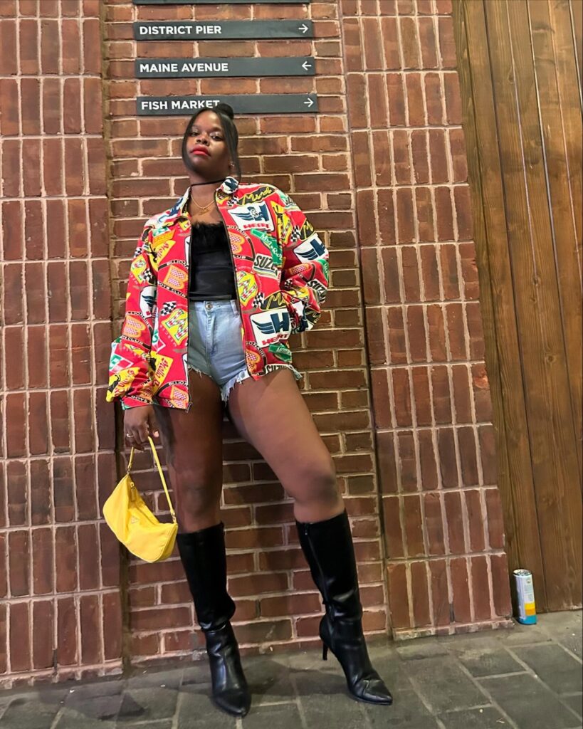 It’s perfect for concerts where bold prints and confident energy take center stage. The relaxed jacket contrasts perfectly with the form-fitting base, creating a baddie-approved look that blends playful attitude with sharp fashion sense.