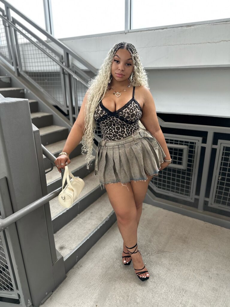Strappy black platform heels add height and attitude, making the fit both bold and balanced. This outfit blends wild prints with edgy textures, creating a head-turning style perfect for festivals or club nights. It’s flirty, fearless, and full of baddie vibes from head to toe.