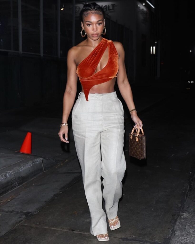 This baddie dinner outfit pairs boldness with elegance through a striking asymmetric velvet crop top in rich burnt orange. The one-shoulder design and angular hem create an architectural silhouette, while the plush fabric adds luxurious depth.
