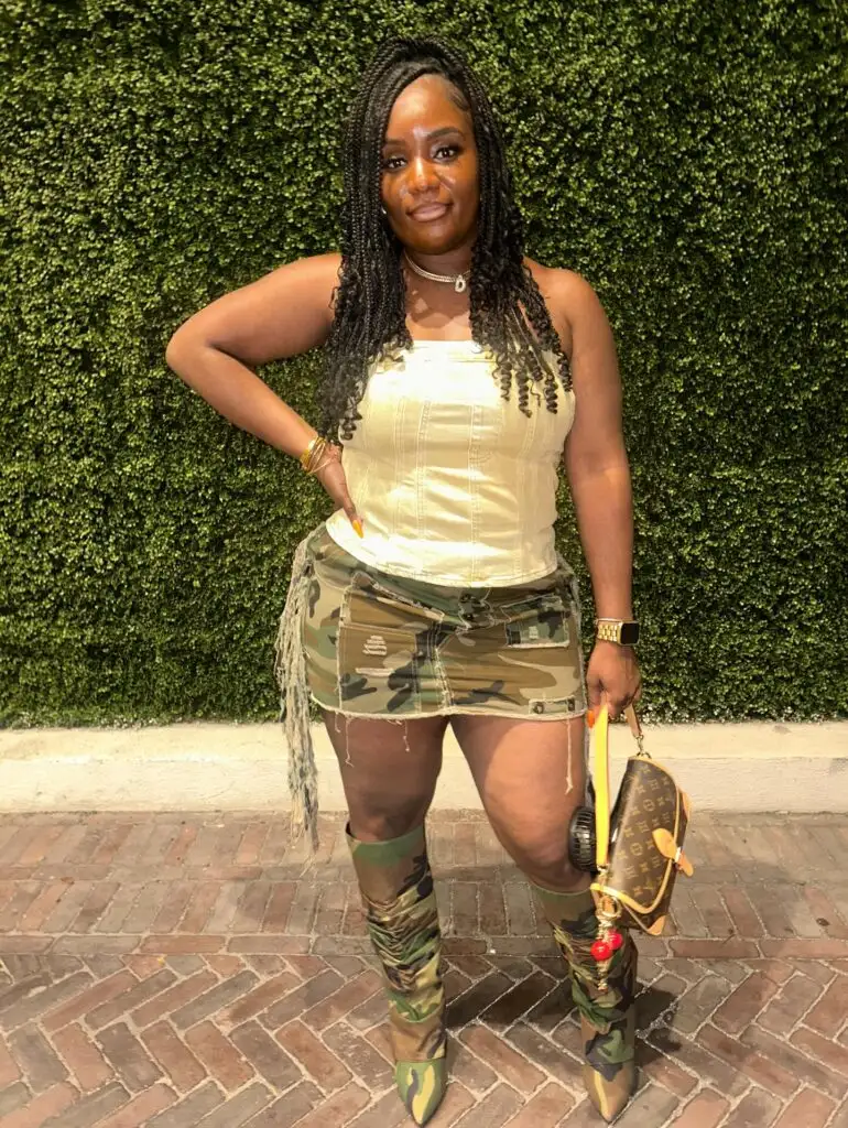 This edgy baddie dinner look mixes rugged style with feminine flair. A fitted beige corset top creates structure and contrast, highlighting the waistline with a flattering silhouette. It’s paired with a distressed camouflage mini skirt for a bold, street-inspired vibe.