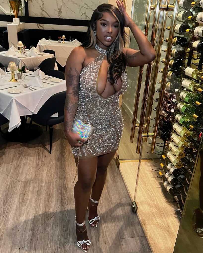 This glamorous baddie dinner outfit shines with a nude-toned mini dress embellished in dazzling crystals and beadwork. The deep plunging neckline adds bold allure, while the fitted silhouette highlights curves effortlessly.