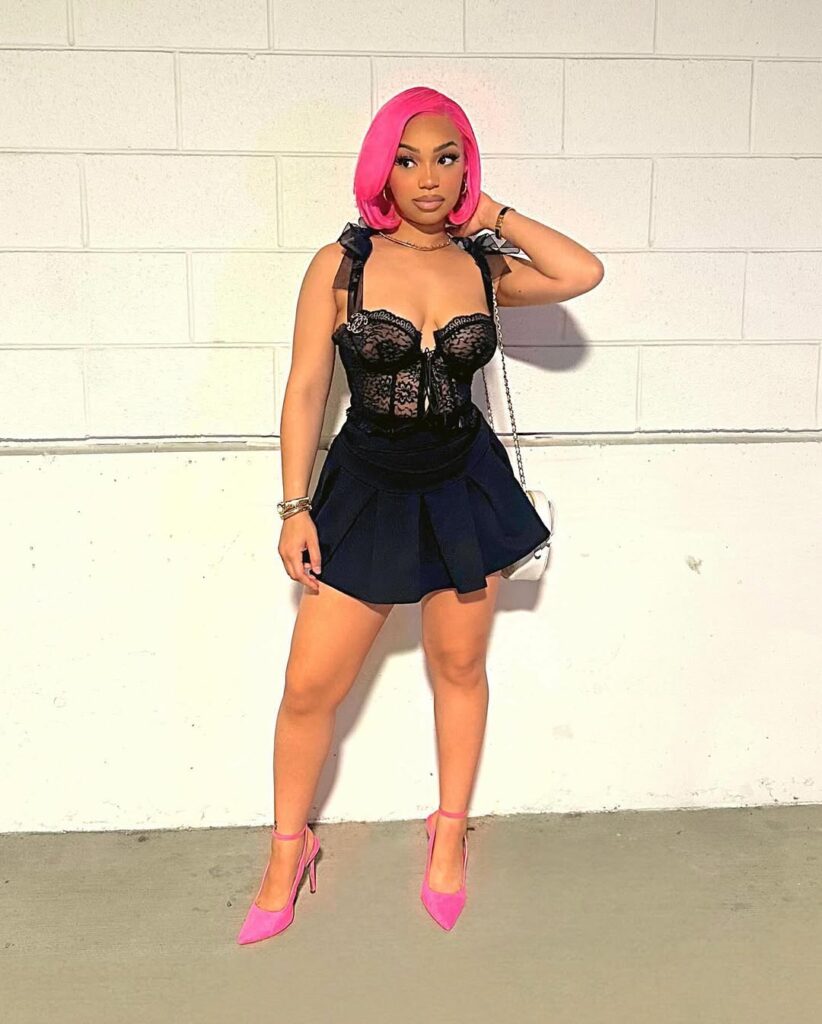 The skirt adds playful movement, balancing the sultry top with youthful charm. Bright pink stilettos match perfectly with the bold pink bob hairstyle, tying the entire look together with vibrant energy. This outfit delivers a mix of edgy allure and chic fun, perfect for a standout dinner appearance.
