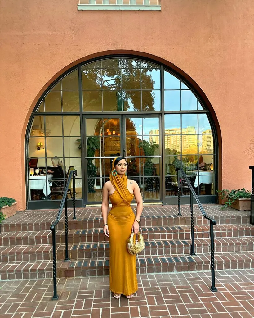 This elegant baddie dinner look features a mustard maxi dress with a sculpted halter neckline that drapes beautifully across the chest. The fitted bodice flows into a sleek, floor-length silhouette, highlighting curves while maintaining a refined finish.