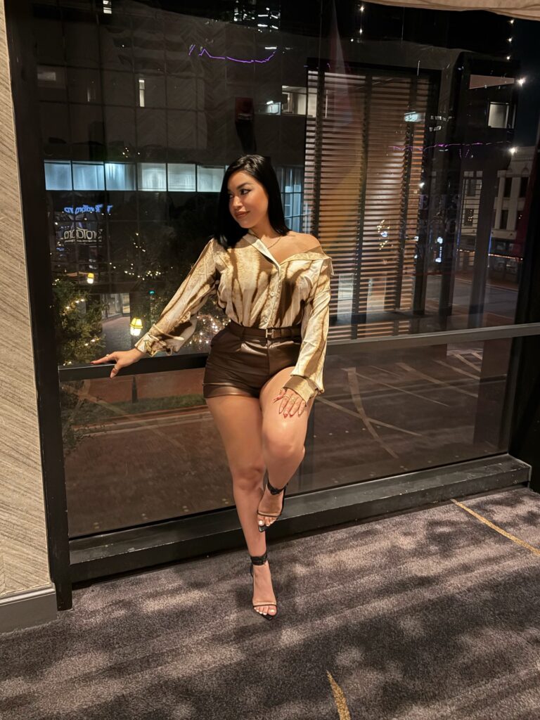 This chic baddie dinner outfit pairs sophistication with edge. A silky satin blouse in soft champagne tones drapes effortlessly, styled off one shoulder for a sultry twist. It’s tucked into high-waisted leather shorts, cinched with a sleek belt to accentuate the waistline.