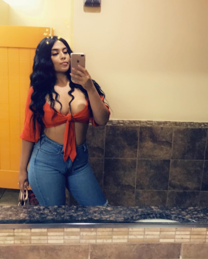 This baddie dinner look combines casual confidence with sultry flair. The bold red tie-front crop top steals attention with its plunging neckline and knotted design, adding both shape and allure.