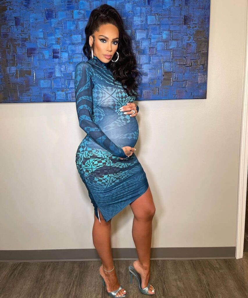 Paired with statement-making thigh-high snakeskin boots, the outfit strikes the perfect balance between bold and elegant. Ideal for a night out or winter photoshoot, this look proves baddie maternity style can be both cozy and iconic.