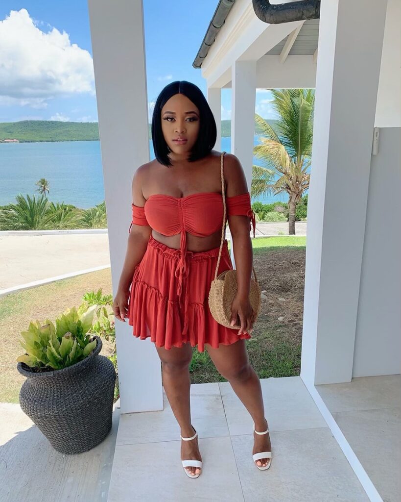 The matching set blends tropical romance with bold baddie energy, effortlessly balancing sweetness and confidence. Whether you’re poolside or exploring a resort, this look delivers the perfect mix of feminine flair and vacation glam.