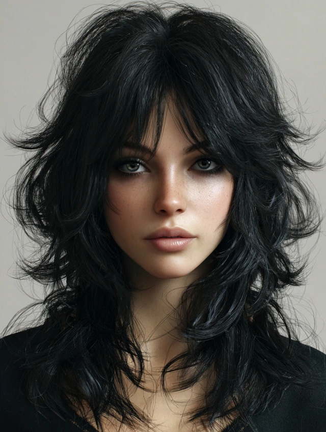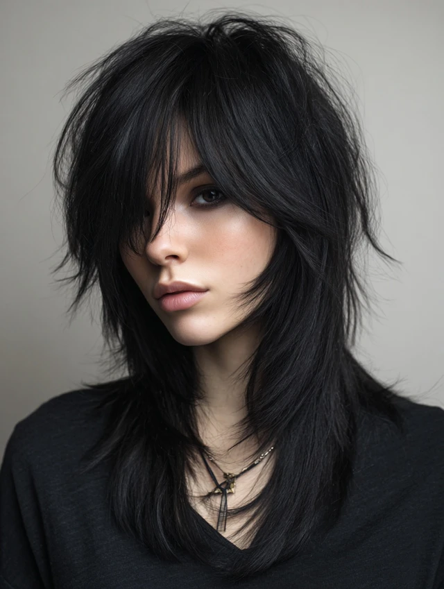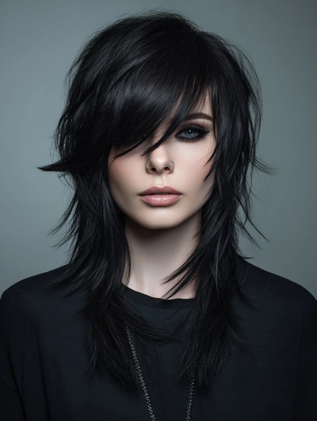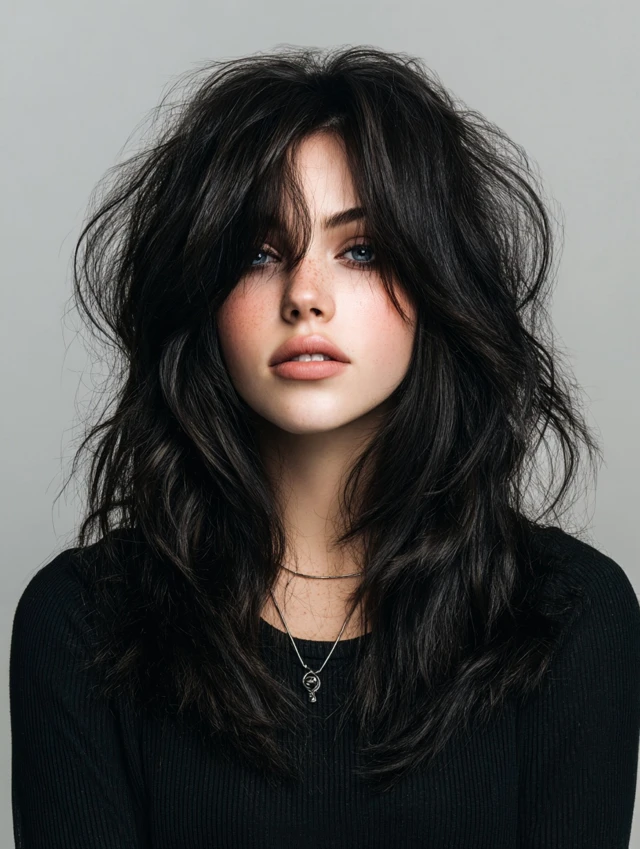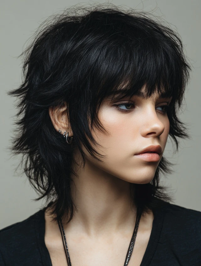 Black wolf haircuts combine edgy, textured layers with a bold, all-black color for a striking, modern look. This hairstyle gives volume at the crown, jagged ends for movement, and a versatile silhouette that works for casual, professional, or fashion-forward settings. Best suited for straight, wavy, or lightly curly hair, this cut enhances medium to thick hair types. Black color emphasizes depth, shine, and texture. Ideal for oval, round, and heart-shaped faces, this style balances edge and sophistication while remaining easy to maintain.