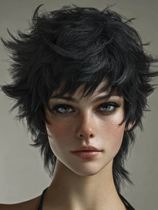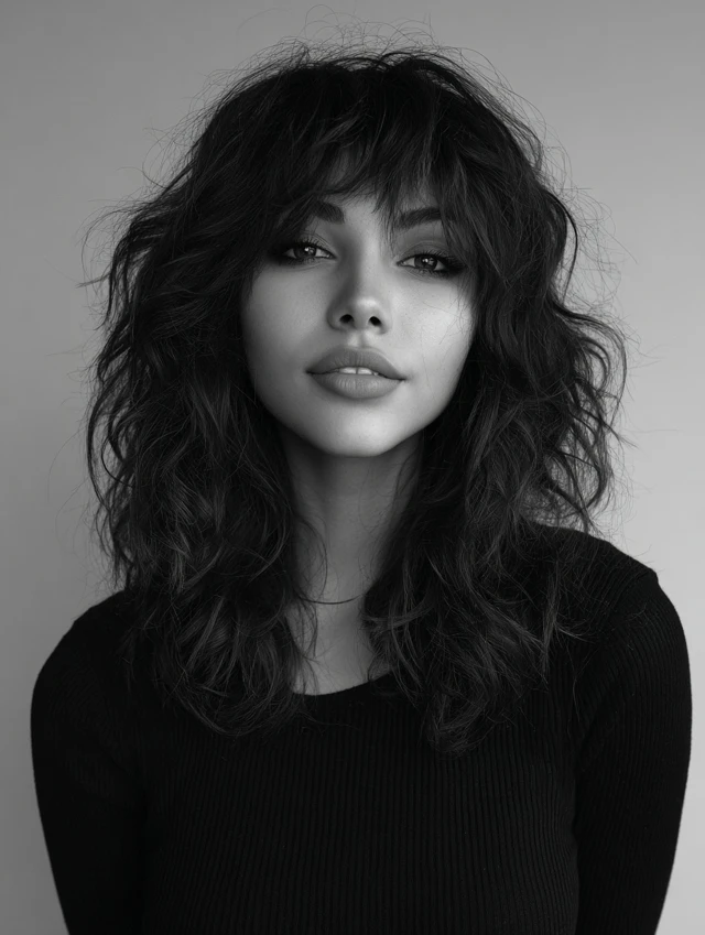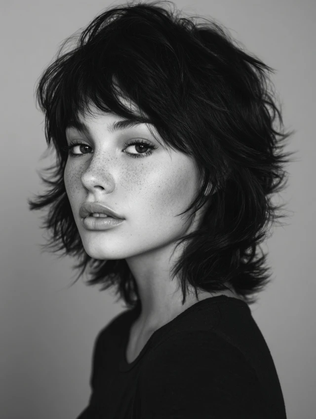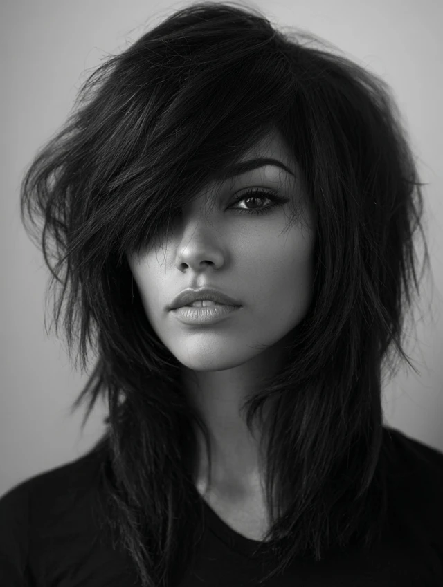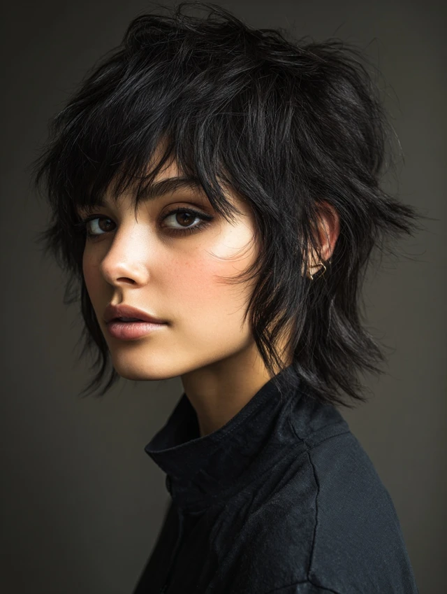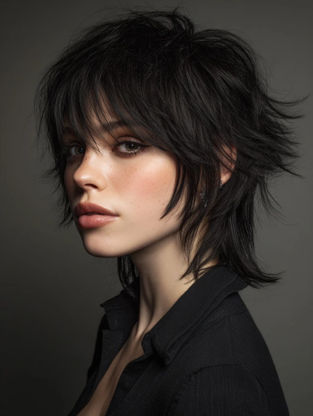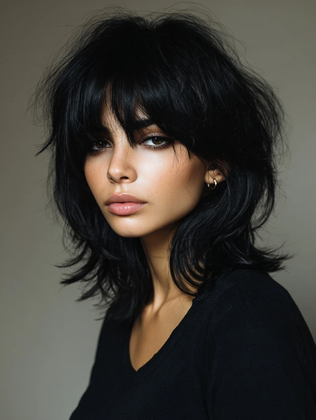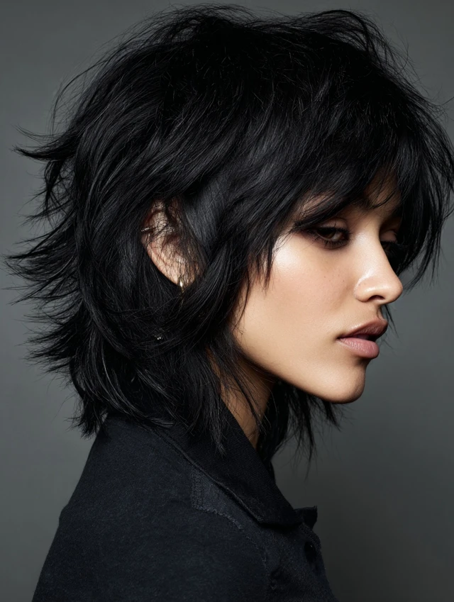 Tousled black wolf cuts create a messy, carefree texture with jagged ends and volume at the crown. Works for oval, round, and heart-shaped faces. Medium to thick hair responds best, enhancing natural movement.