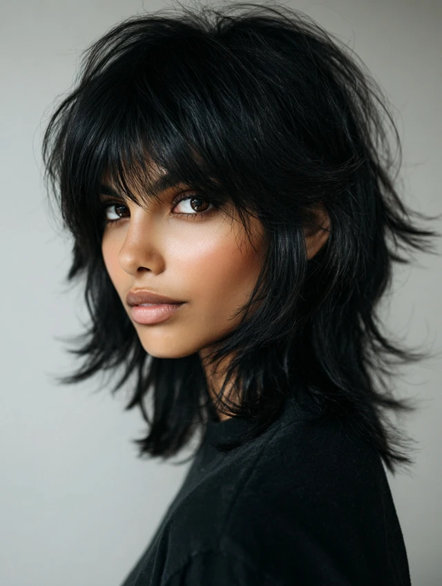 The classic black wolf cut features jagged layers at the crown and tapered ends. Works well for oval, round, and heart-shaped faces. Medium to thick hair holds the layers and texture naturally.