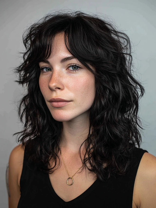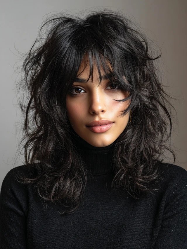Wavy black wolf cuts pair natural waves with jagged layers, softening angles and adding dimension. Works for oval and square faces. Medium to thick wavy hair displays volume and movement beautifully.