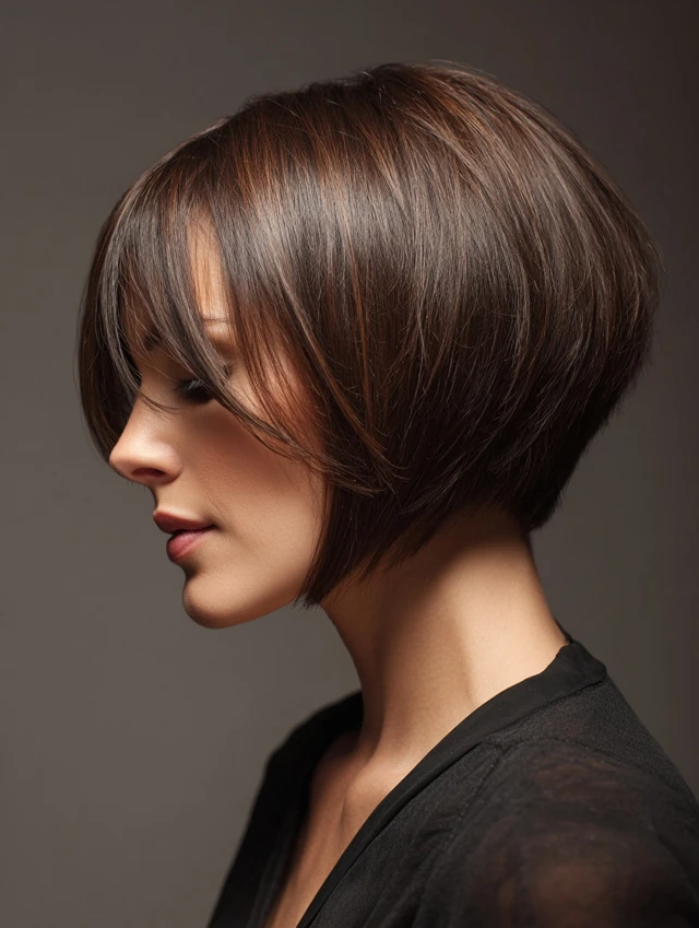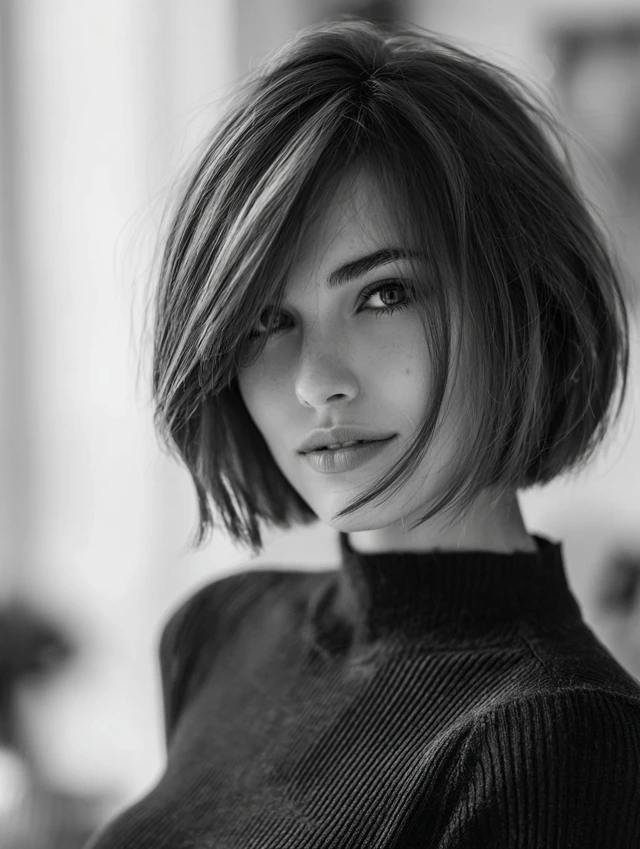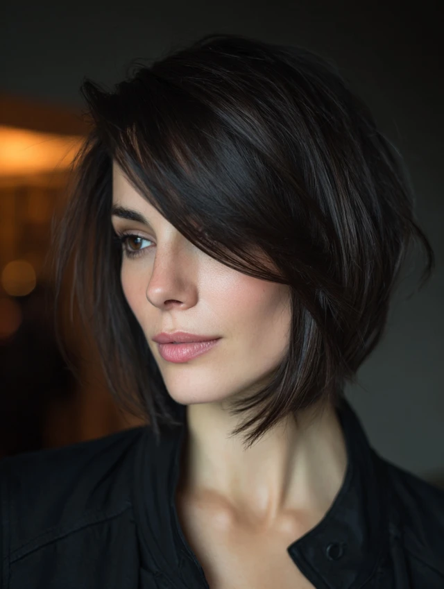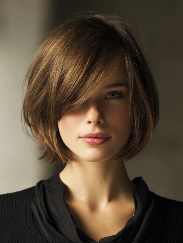 A bob with side-swept bangs softens the face and draws attention to the eyes while adding volume to fine hair. The bangs blend seamlessly with the rest of the bob.