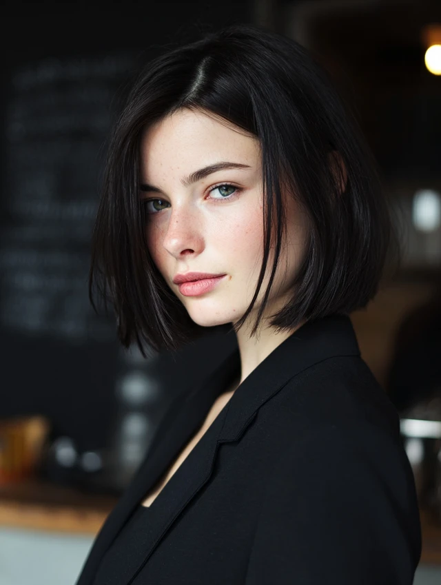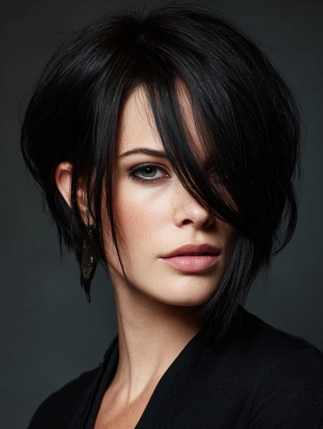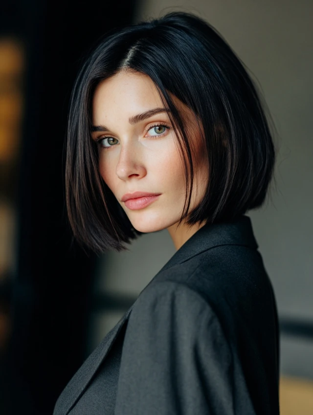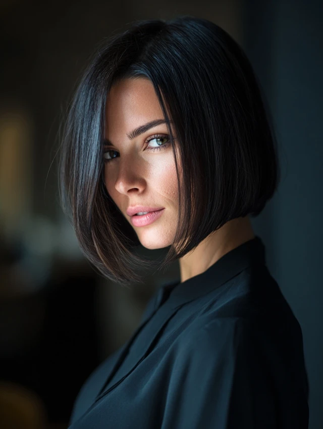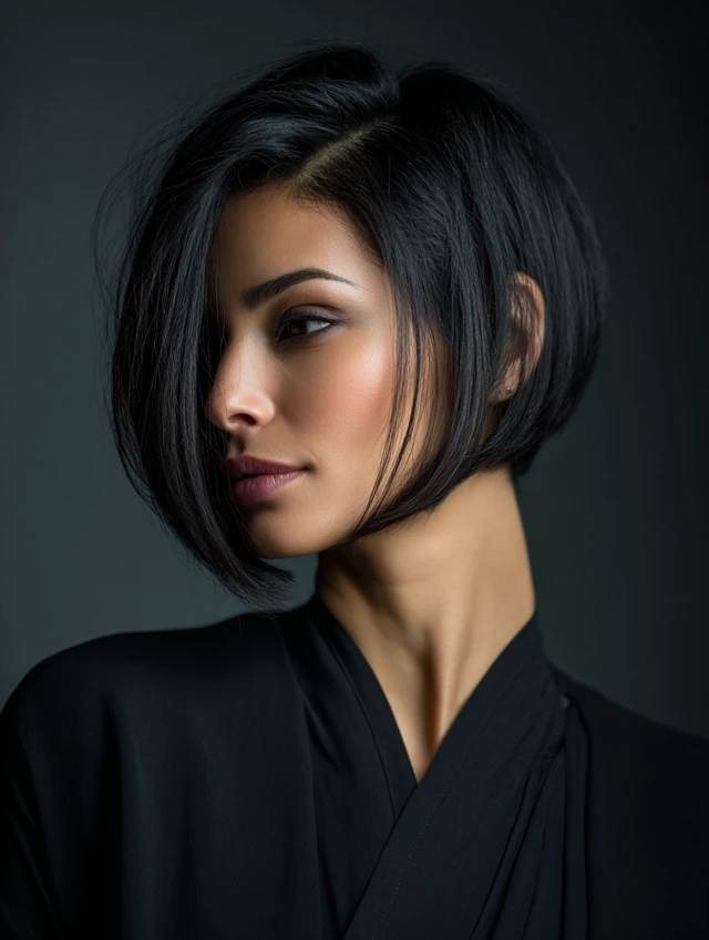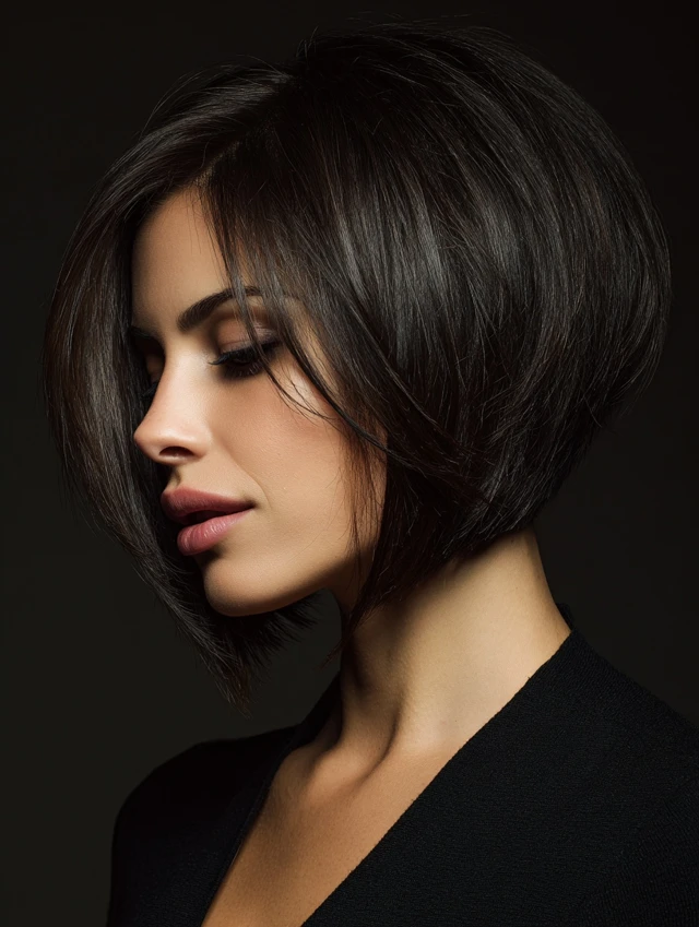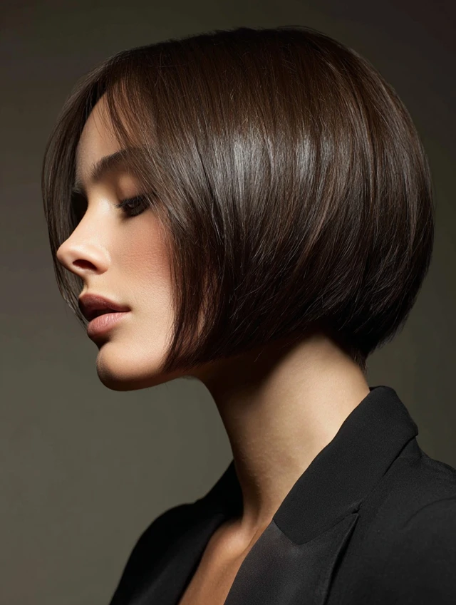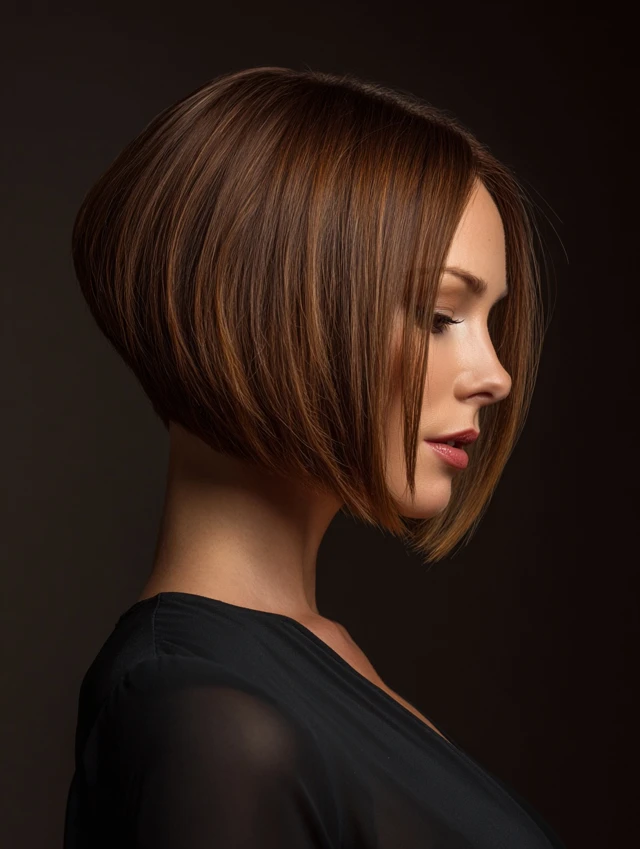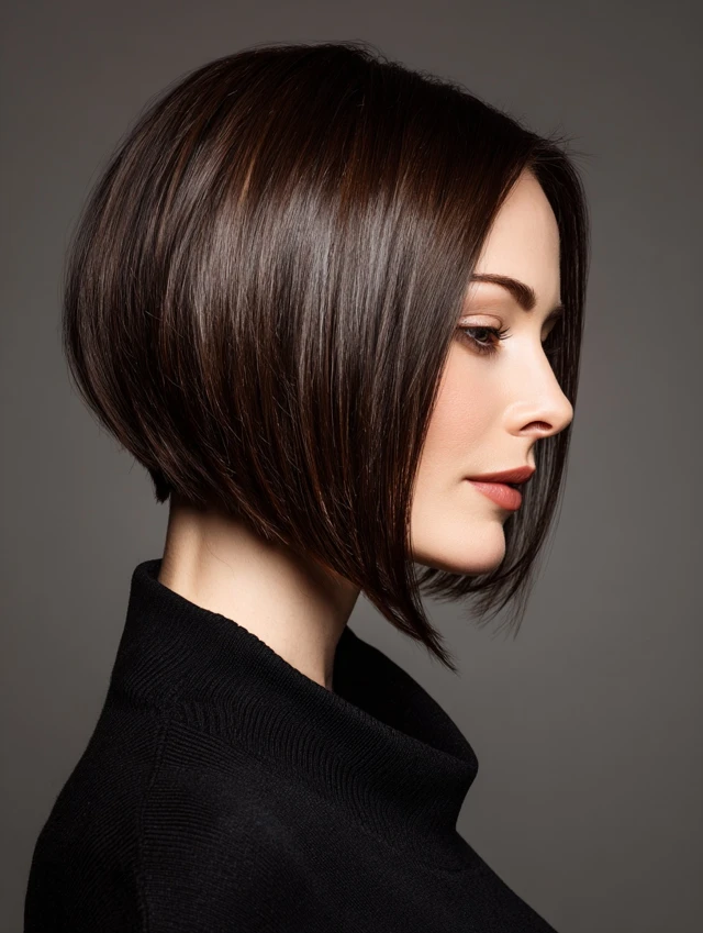An angled bob is shorter at the back and longer at the front, creating vertical lines that elongate a round face. The sharp angles add sophistication and structure.