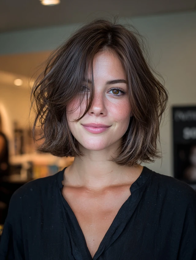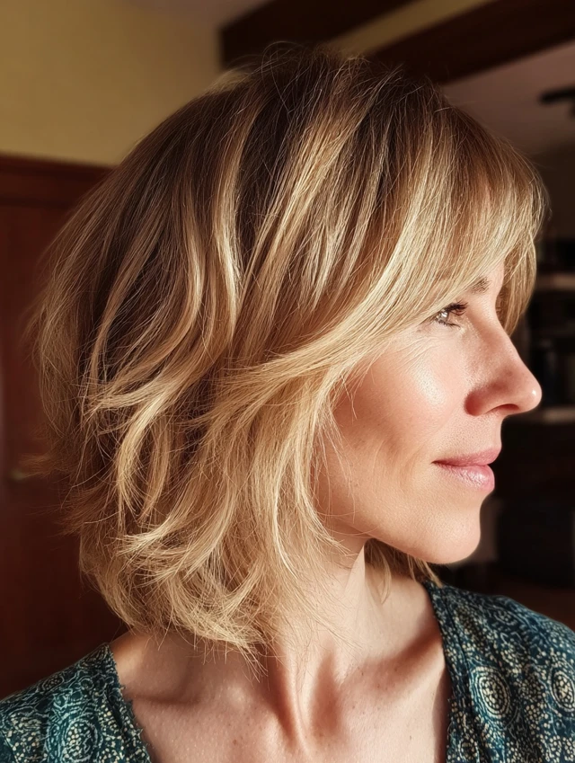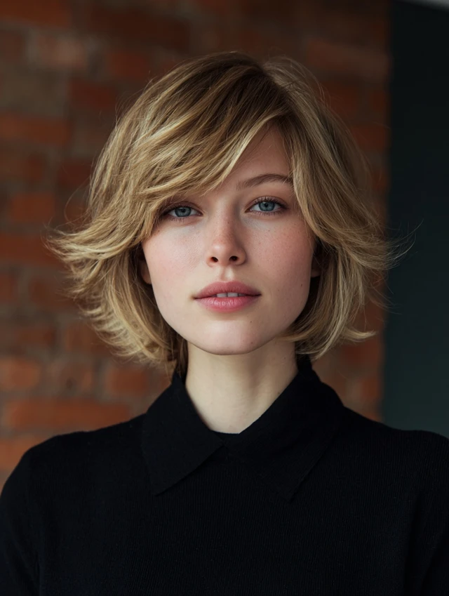 This cut suits fine, medium, or thick hair. Works especially well for round faces. Styling with a round brush or texturizing product enhances layers and gives a fuller, balanced appearance.