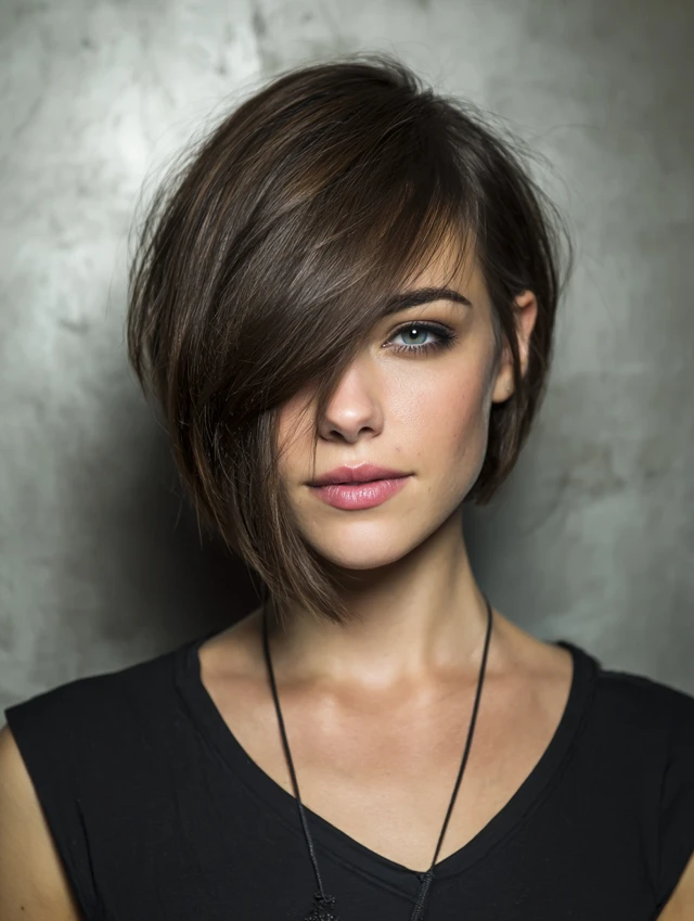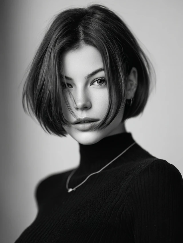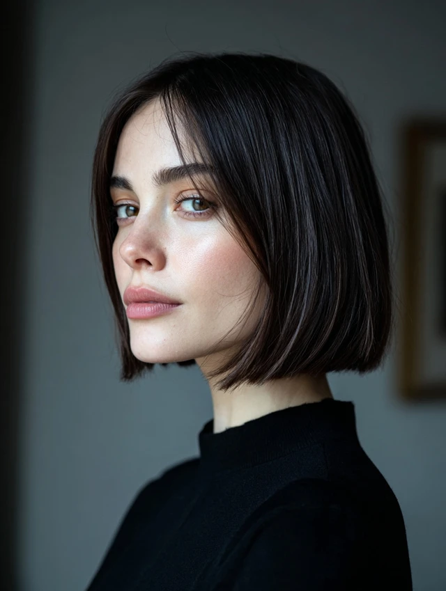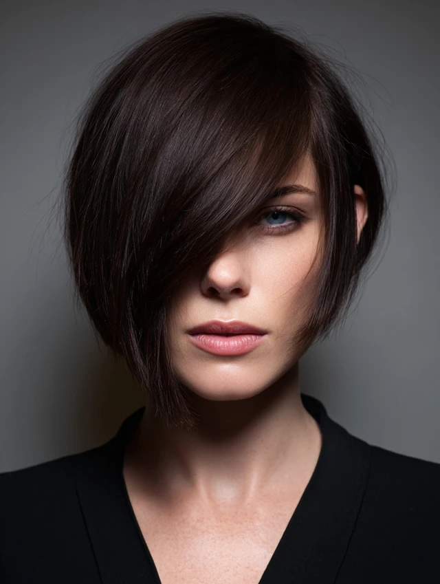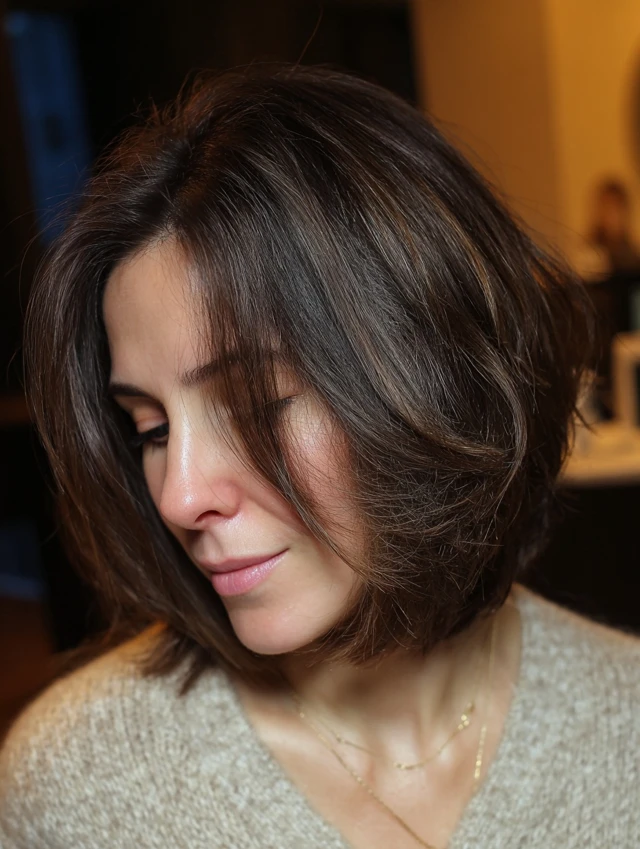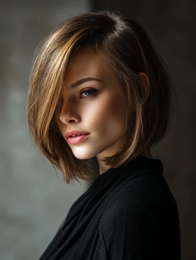 A side-parted bob creates asymmetry that visually slims the face. The deep part draws attention away from the roundness of cheeks, creating a flattering silhouette.