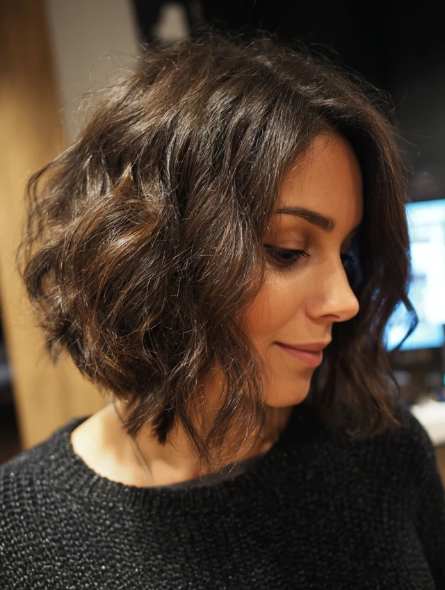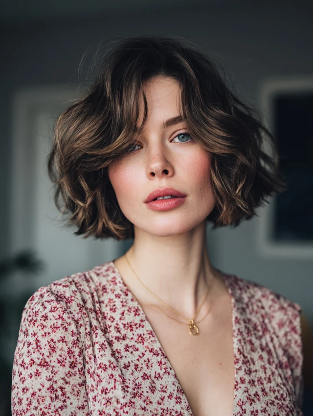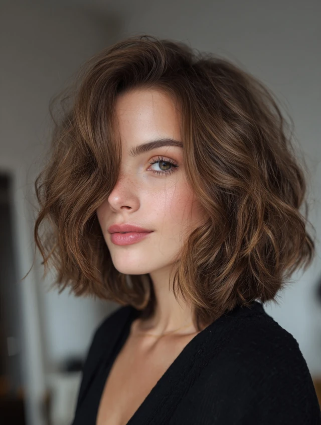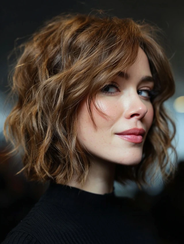 A textured wavy bob adds volume and movement without adding width to the face. Waves soften features while giving a youthful, playful look.