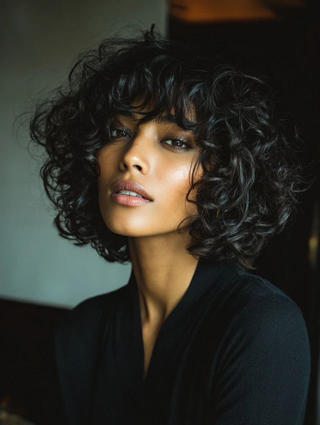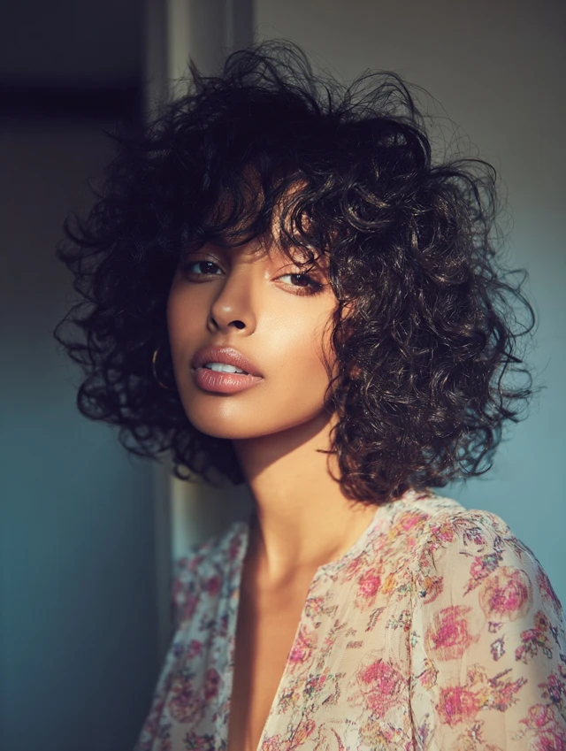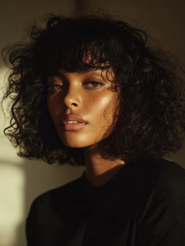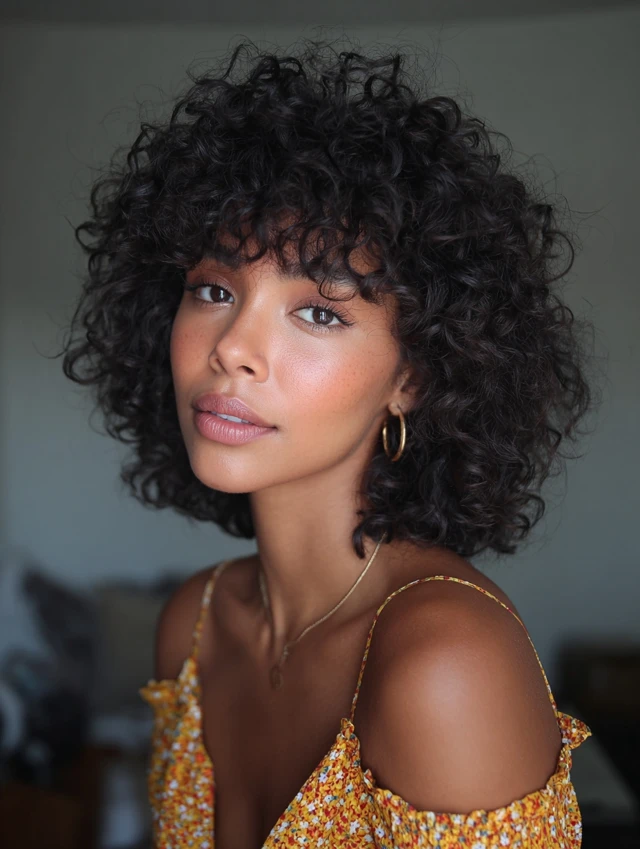 A curly bob with wispy bangs enhances texture and volume for Black women with natural curls. Wispy bangs prevent heaviness at the front while the bob shape highlights curls’ bounce and definition.