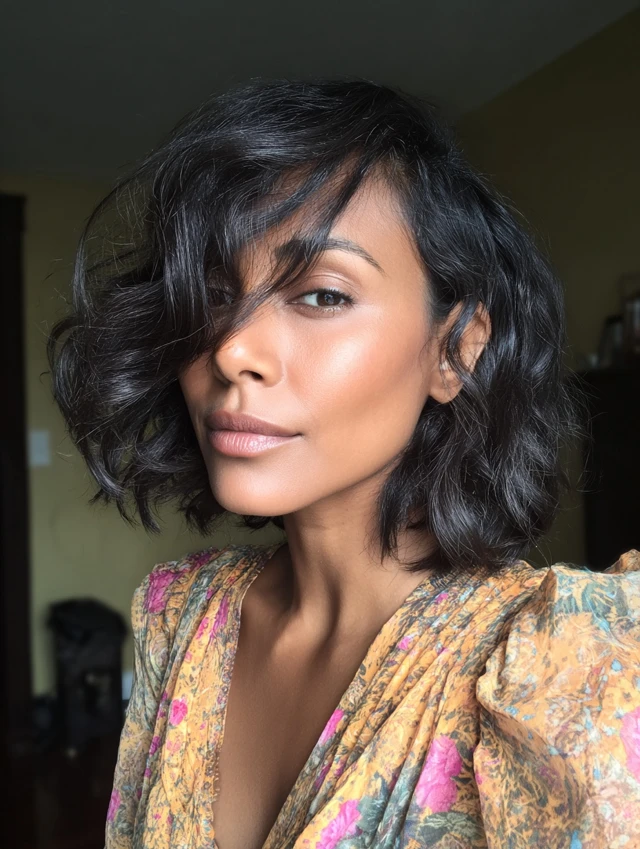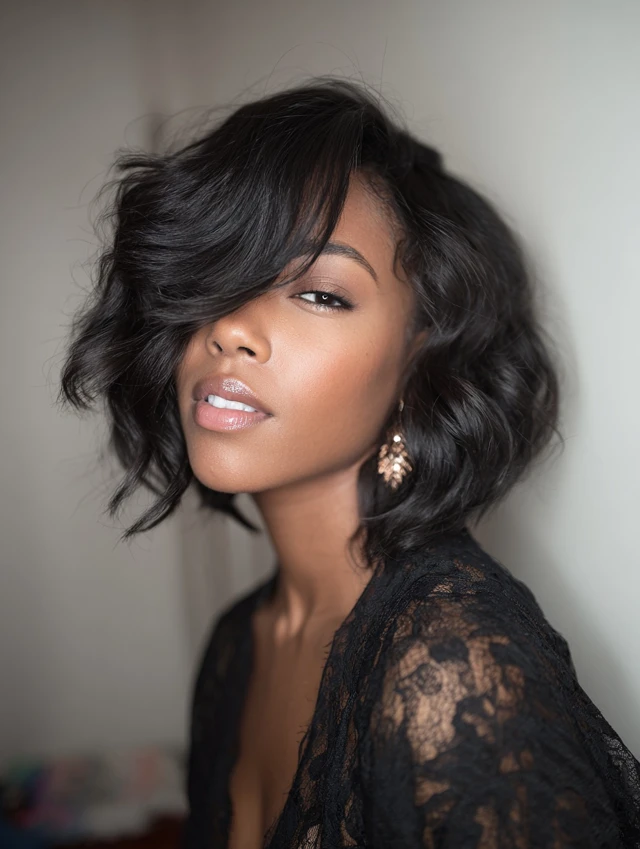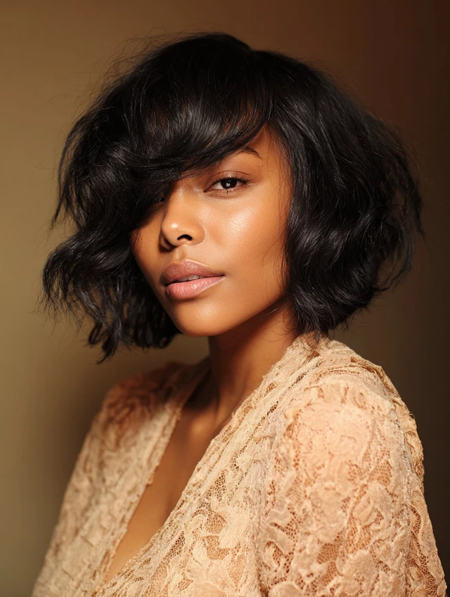 Wavy bobs with side-swept bangs soften features and add movement to thin or fine hair. The waves create volume while the side bangs frame the face naturally, offering a playful, modern look.