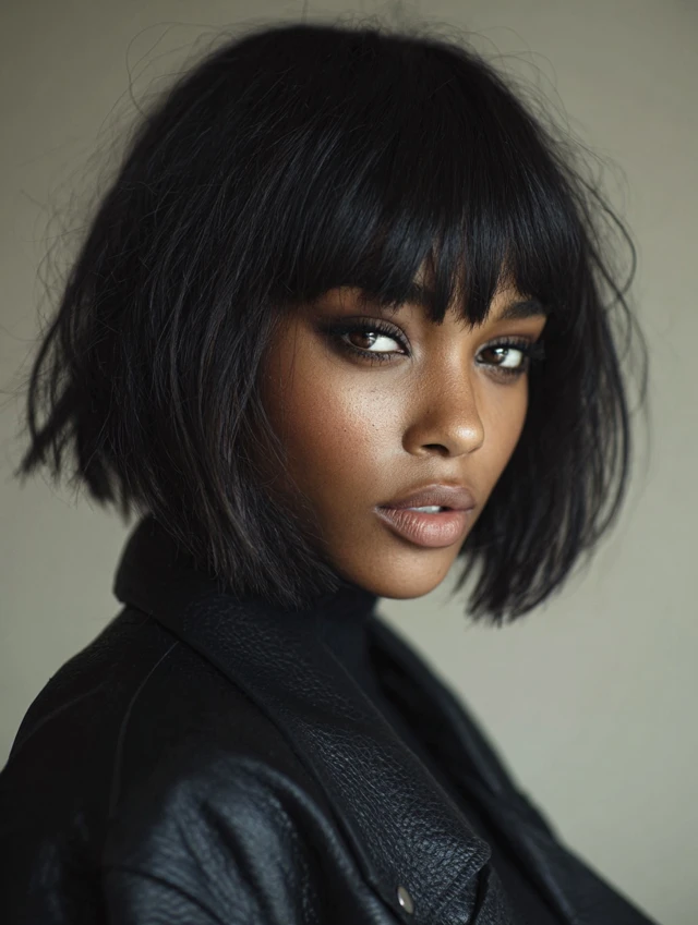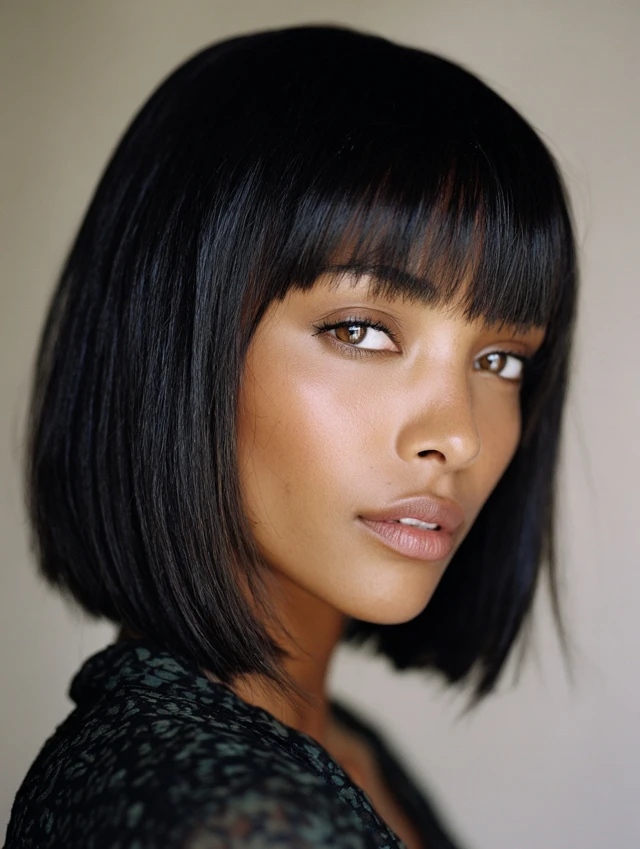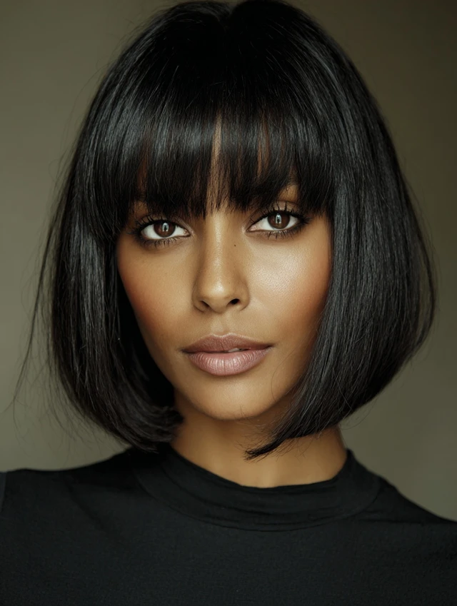 A classic straight bob with blunt bangs offers a polished, sophisticated look. Blunt bangs frame the eyes and balance facial features while the straight bob emphasizes symmetry. It works well for both natural and relaxed hair textures.