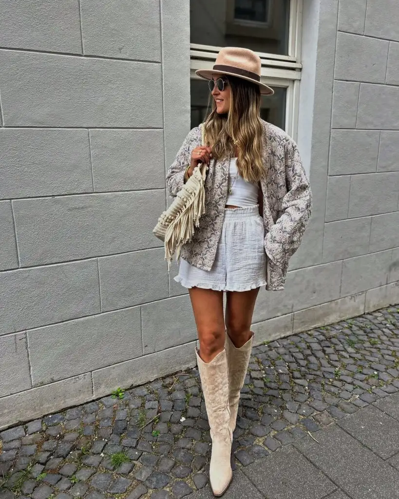 White Boho Shorts with Embellished Vest and Suede Western Boots