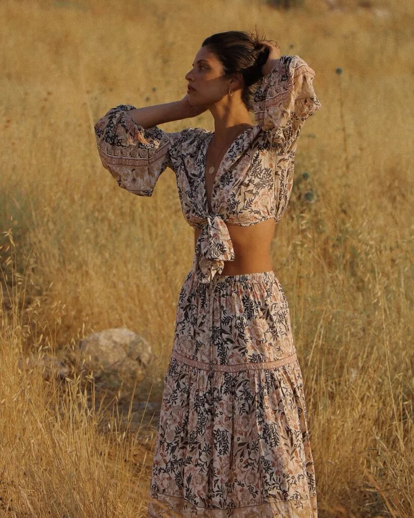 - Summer: Choose lightweight maxi dresses, floral crop tops with high-waisted skirts, and flat sandals. Add a straw hat and woven bag for a beachy boho feel.