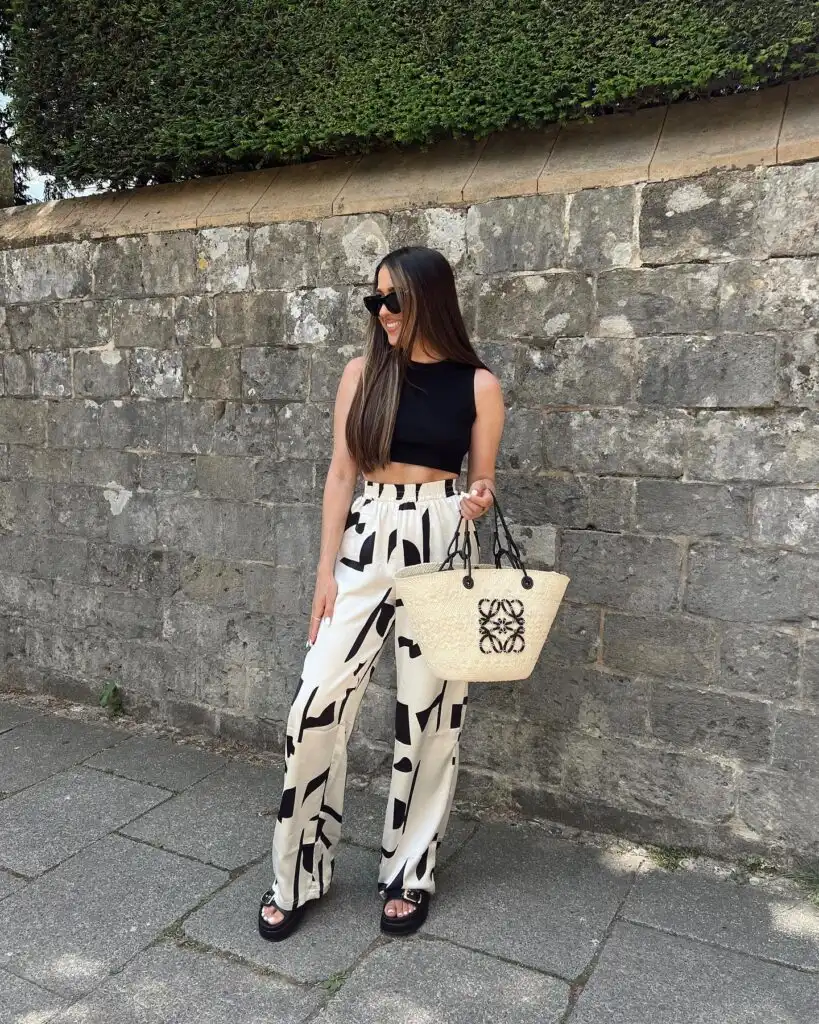 This striking summer outfit pairs a sleek black crop top with high-waisted, wide-leg trousers in a bold black-and-white abstract print. The lightweight, flowing fabric adds movement, keeping the look breezy and comfortable.