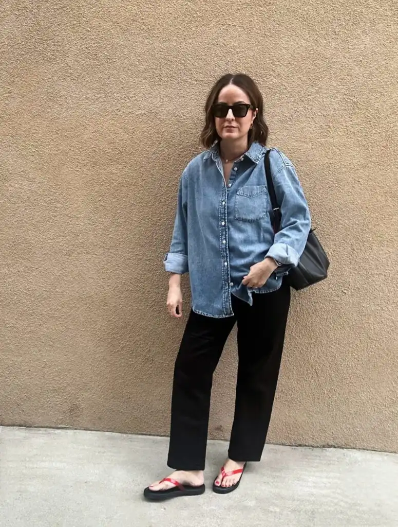 A relaxed denim button-up shirt pairs effortlessly with straight-cut black pants, creating a clean yet casual summer look. The slightly oversized fit of the shirt adds comfort and movement, while the darker pants keep the outfit grounded.
