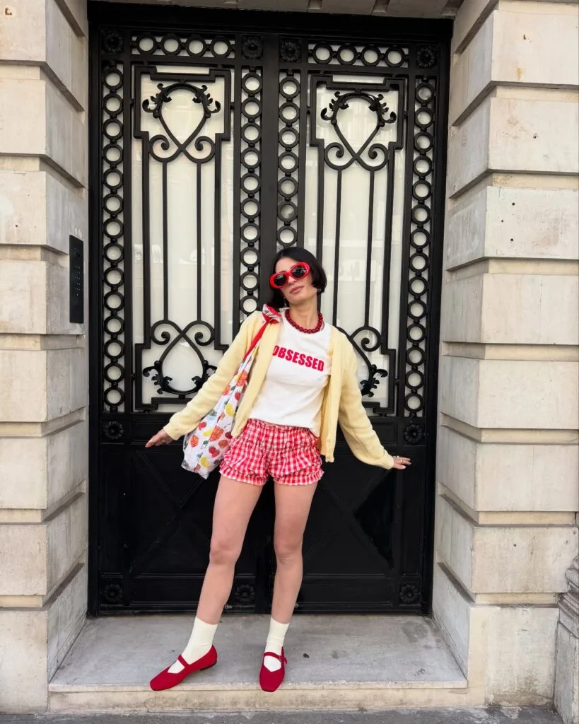 This outfit bursts with energy, pairing a bold red-lettered graphic tee with lively red-and-white gingham shorts. A sunny yellow cardigan adds warmth and a cheerful pop, making the look even more inviting.