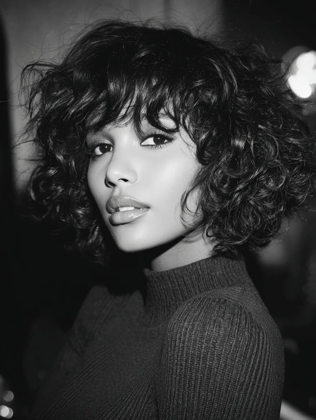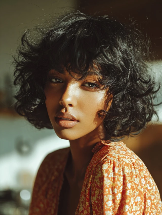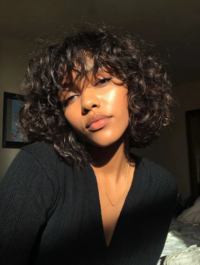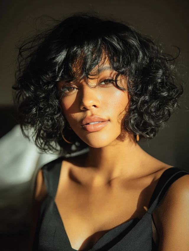 Curly chin-length bobs with wispy bangs highlight natural texture while preventing heaviness at the front. Wispy bangs give softness to the face, and curls provide fullness and bounce.