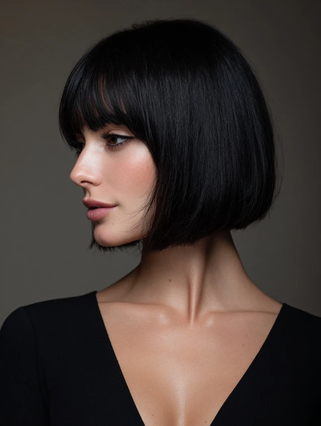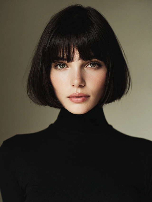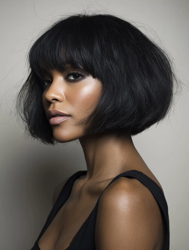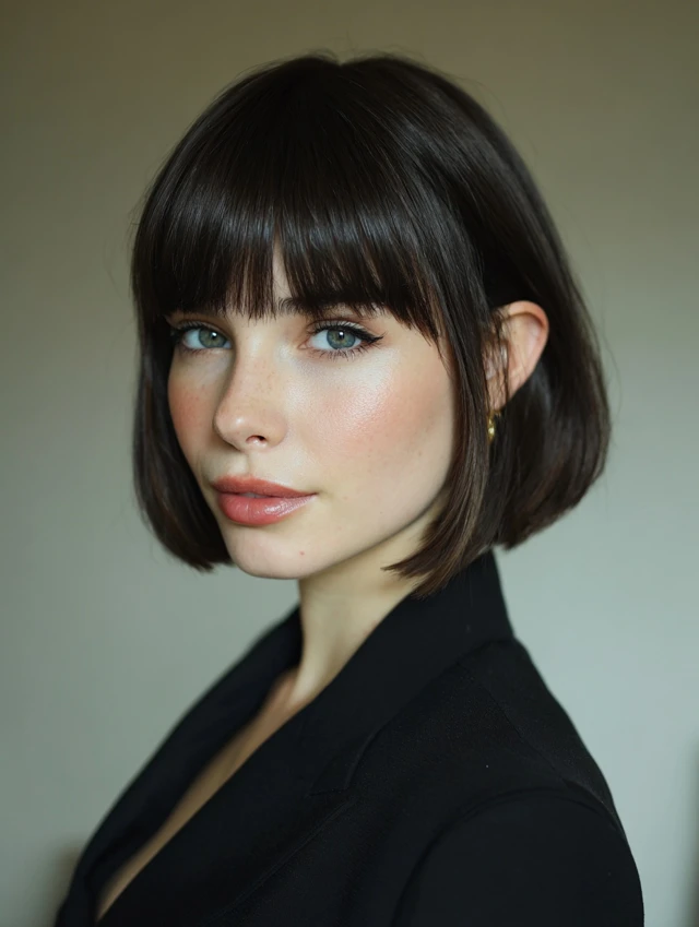 A classic blunt chin-length bob with bangs creates a sleek, sophisticated look. The straight cut emphasizes symmetry while the bangs frame the eyes and soften the forehead. This style works well on straight or slightly wavy textures.