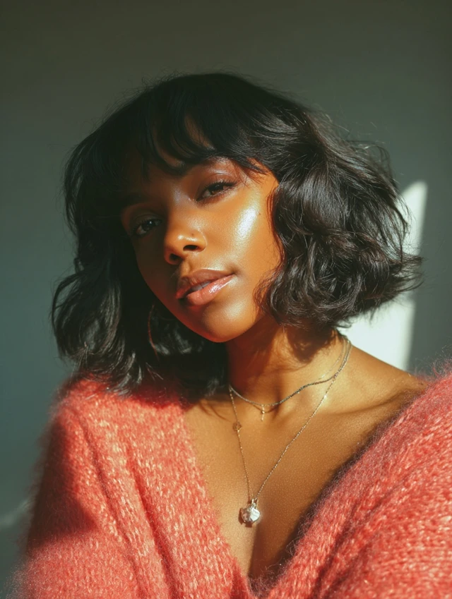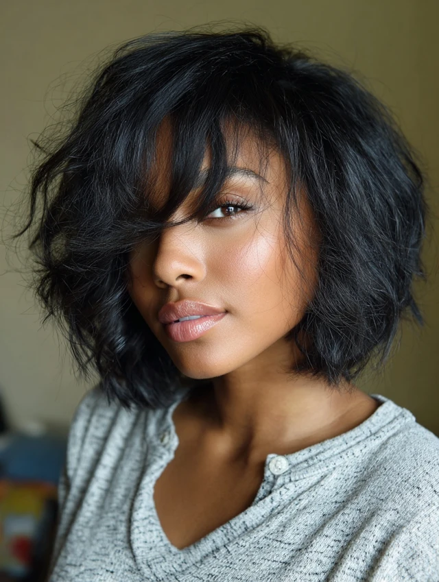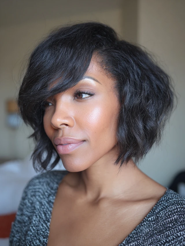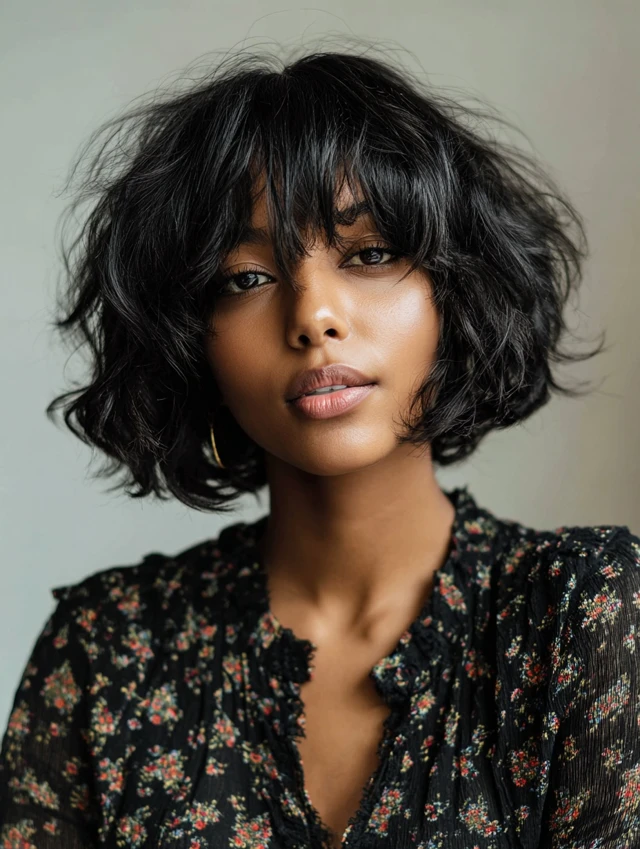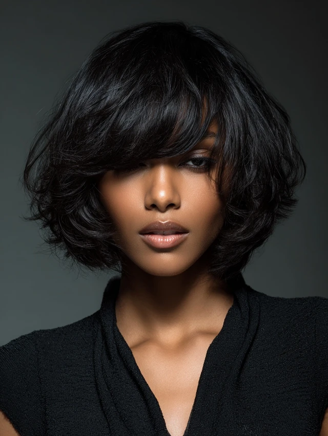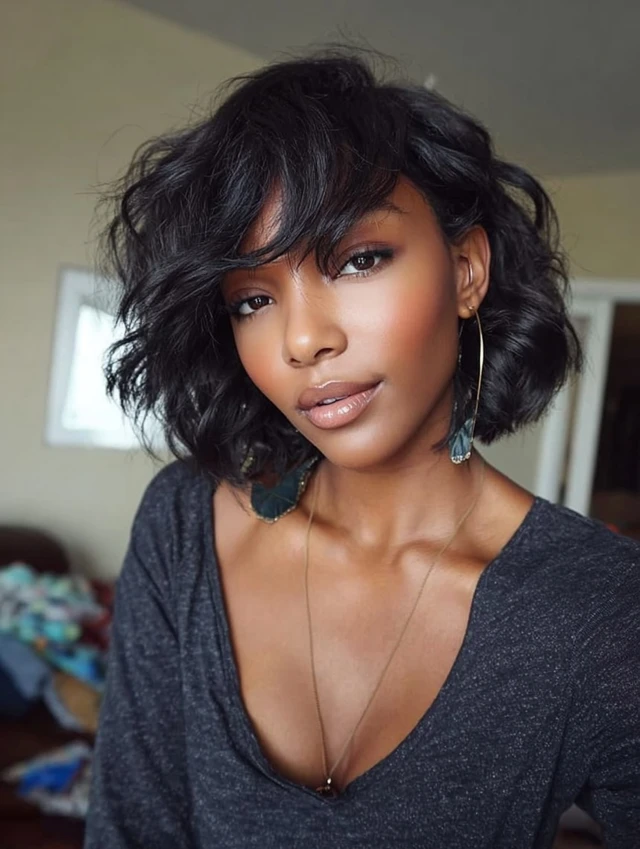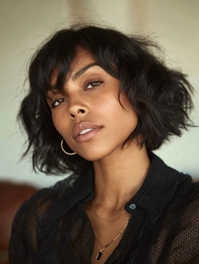 Wavy chin-length bobs with side-swept bangs add movement and texture. The waves create volume, while the side bangs balance the face and soften angular features, making it playful yet chic.