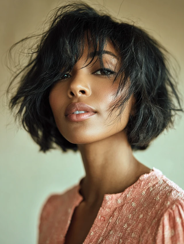 A textured chin-length bob with side bangs adds visual interest and volume. Side bangs soften the face, while textured ends create movement, making thin or fine hair appear fuller.