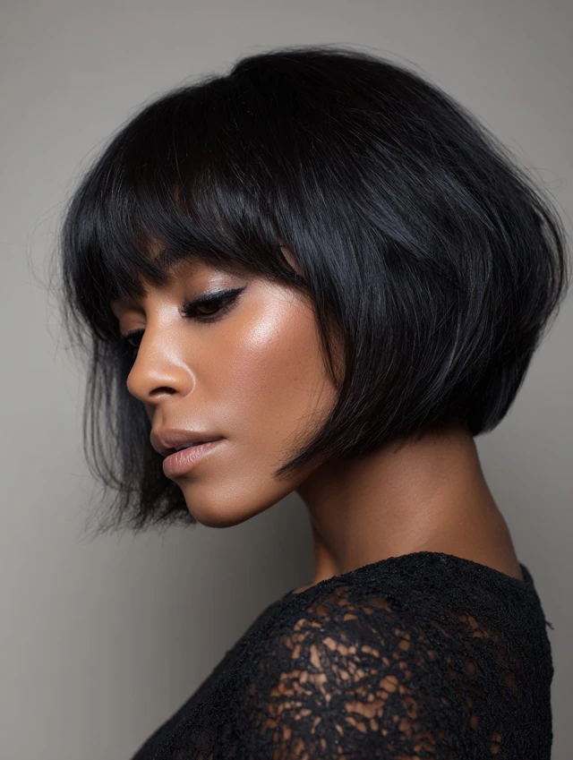 An angled chin-length bob with micro bangs creates a modern, edgy appearance. The longer front pieces elongate the face subtly, while micro bangs draw attention to the eyes and cheekbones.