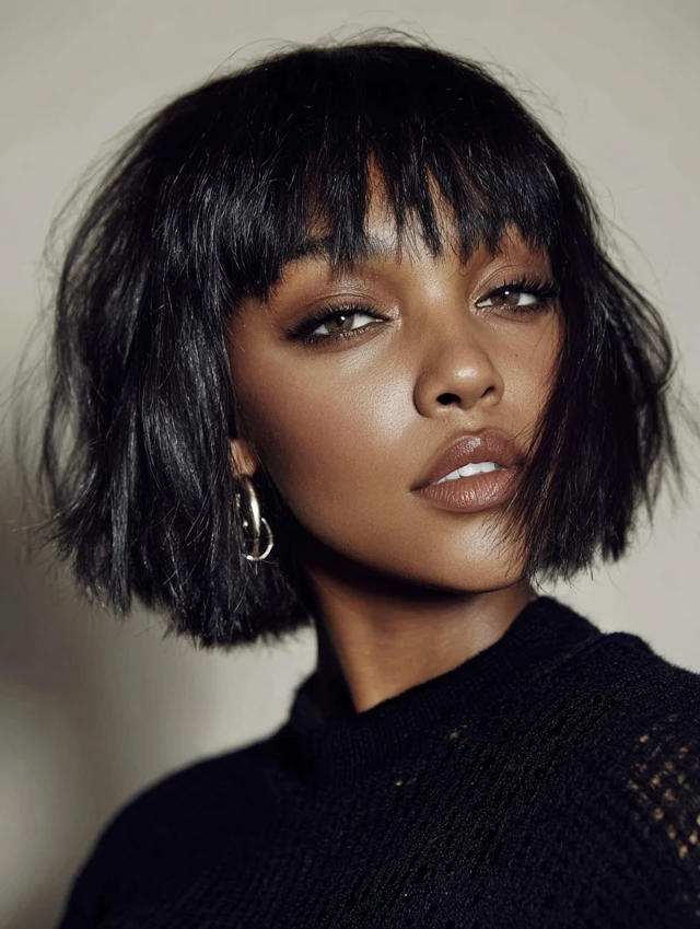 Chin-length bob hairstyles with bangs are a chic, versatile choice for women of all textures and face shapes. They balance structure with softness, framing the face while highlighting features like eyes, cheekbones, and jawline. This length is perfect for managing thin, thick, or textured hair while giving the option to play with bangs—blunt, wispy, or side-swept. The result is a stylish, modern look that works for both casual and formal settings. Chin-length bobs are manageable, elegant, and allow for playful variations in texture and styling.