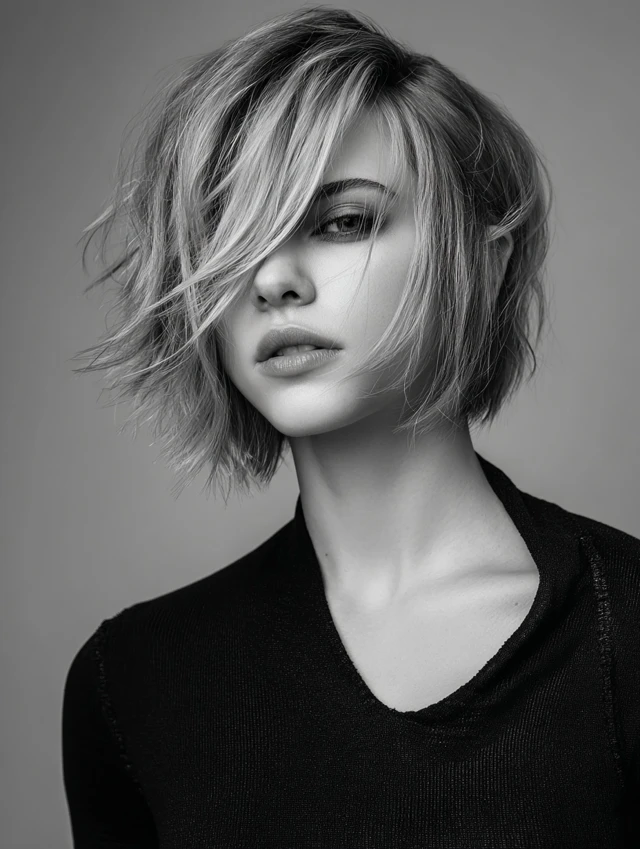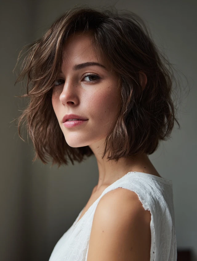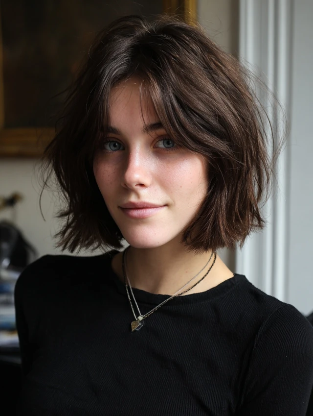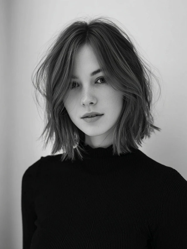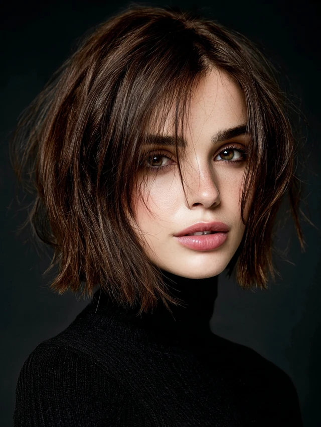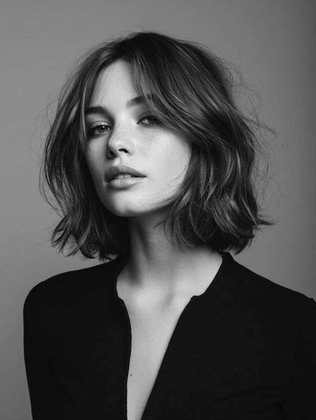A classic choppy bob features soft, layered ends that create movement and volume. The uneven layers prevent fine hair from looking flat and give a playful, youthful appearance.