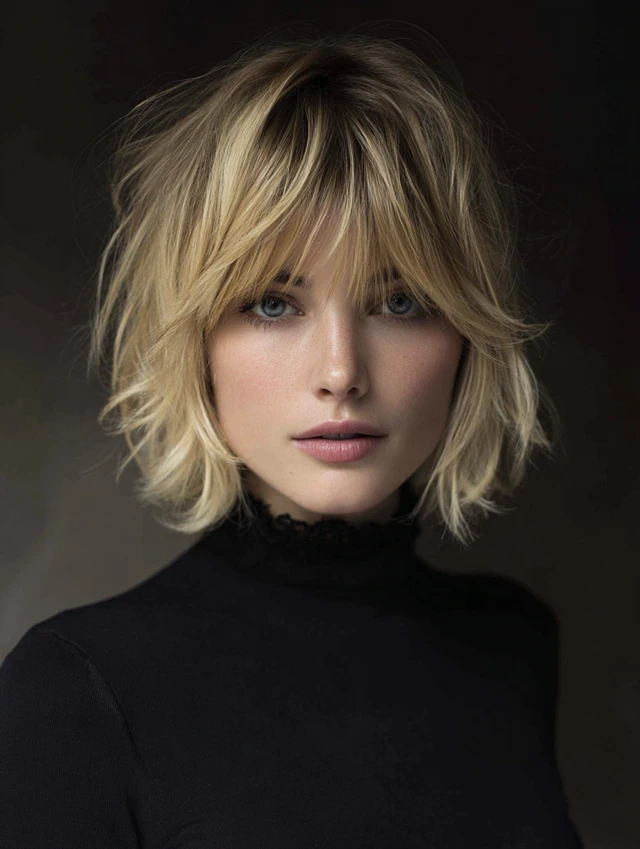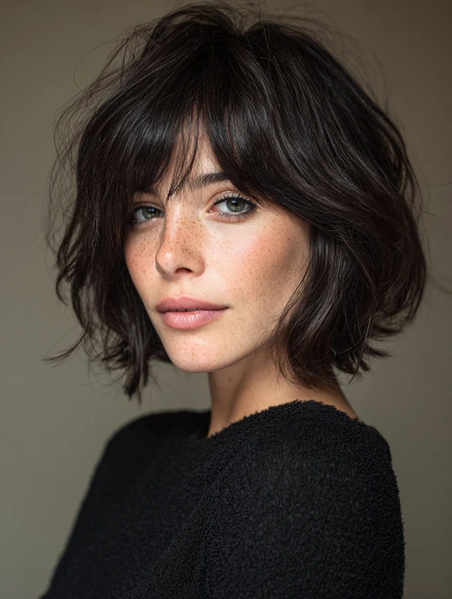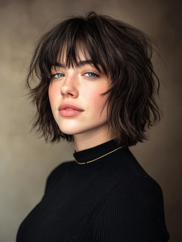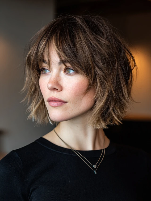 Adding bangs to a choppy bob softens the face and adds dimension. Wispy or curtain bangs blend seamlessly with textured layers.