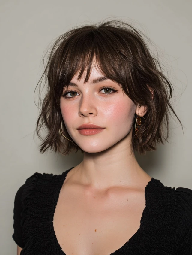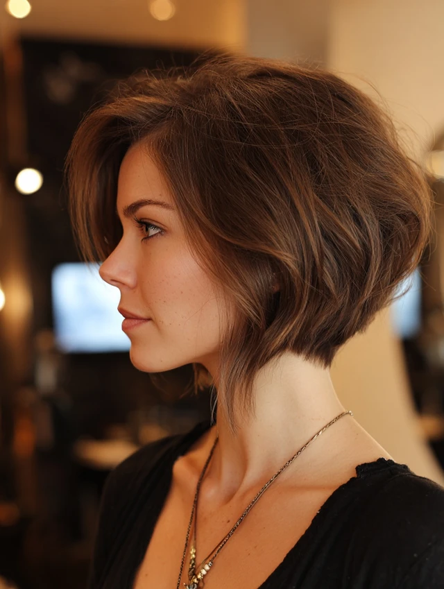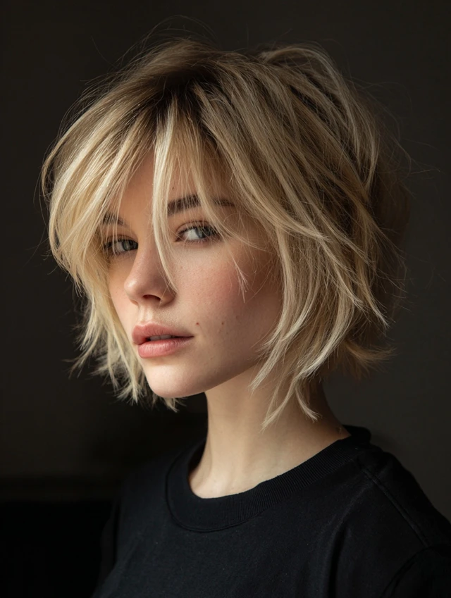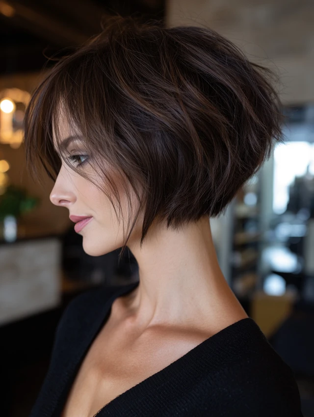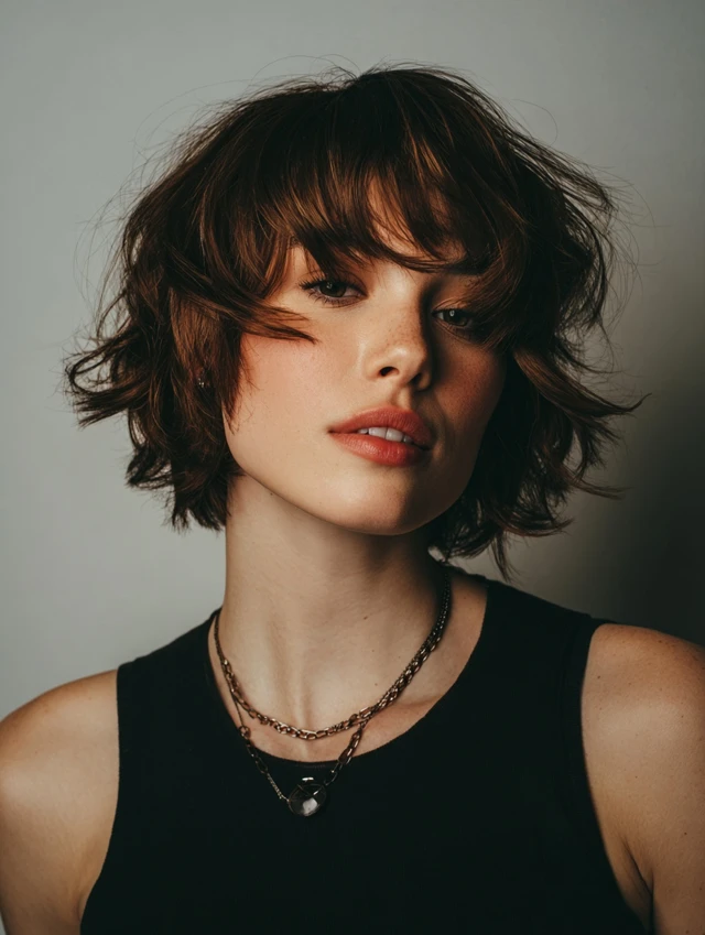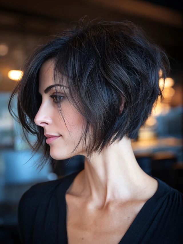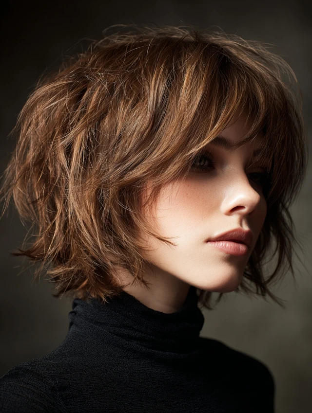 A short choppy bob sits above the jawline with textured layers that boost lift at the crown. It’s bold, modern, and easy to maintain.