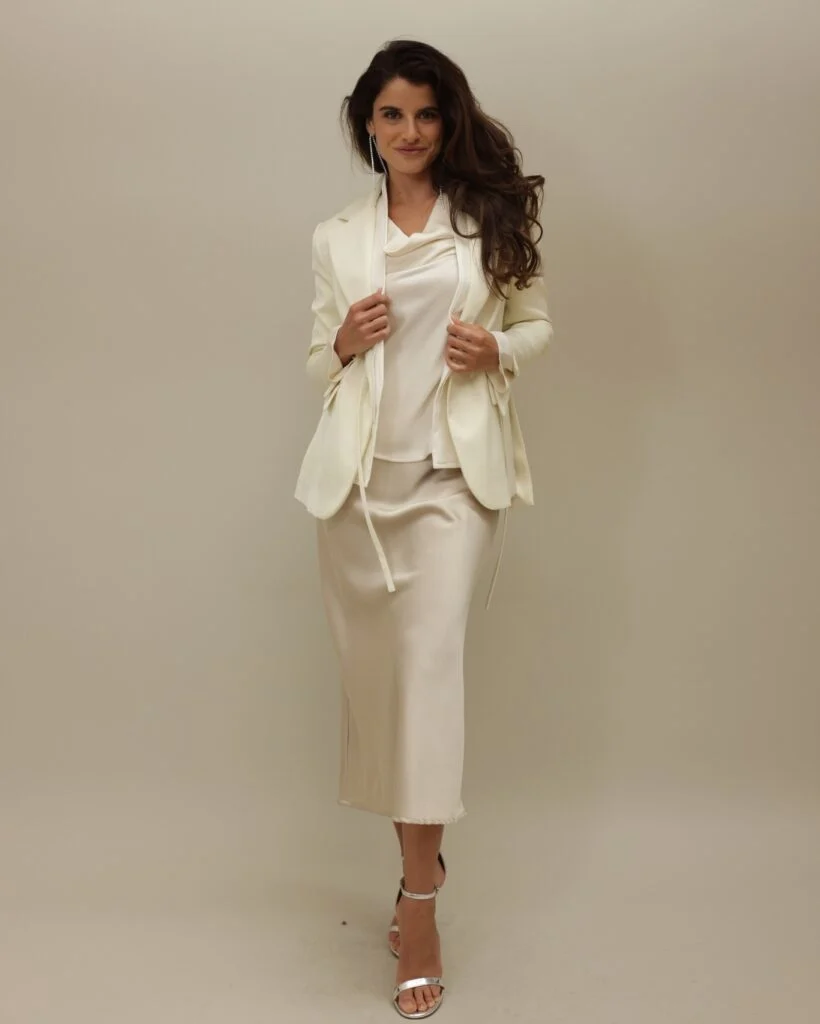 This birthday look is graceful, polished, and timeless. Featuring a silky ivory cowl-neck blouse paired with a matching satin midi skirt, the outfit flows with effortless charm. A fitted blazer in the same creamy hue adds structure and refinement, while metallic strappy heels bring a modern sparkle.