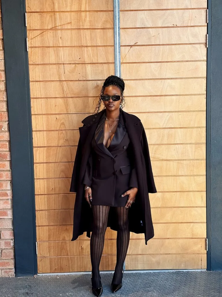 This birthday look is bold, commanding, and unapologetically stylish. The oversized black blazer dress features sharp tailoring and a deep neckline, striking the perfect balance between feminine and fierce.