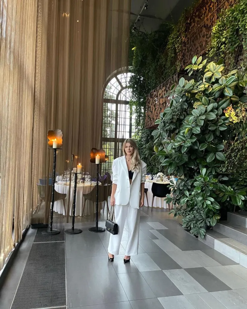 Paired with white ankle-strap heels, the ensemble is sleek and timeless—ideal for a birthday brunch or a chic dinner party. The all-white palette gives off a confident, fresh vibe that feels effortlessly classy and modern.