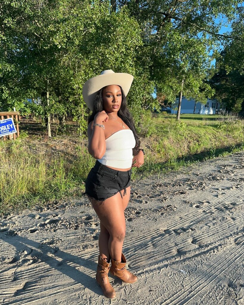 This laid-back cowgirl look is all about effortless charm and summer ease. A white ribbed tube top keeps things cool and fitted, paired with high-waisted black cutoff shorts that add just the right amount of edge.