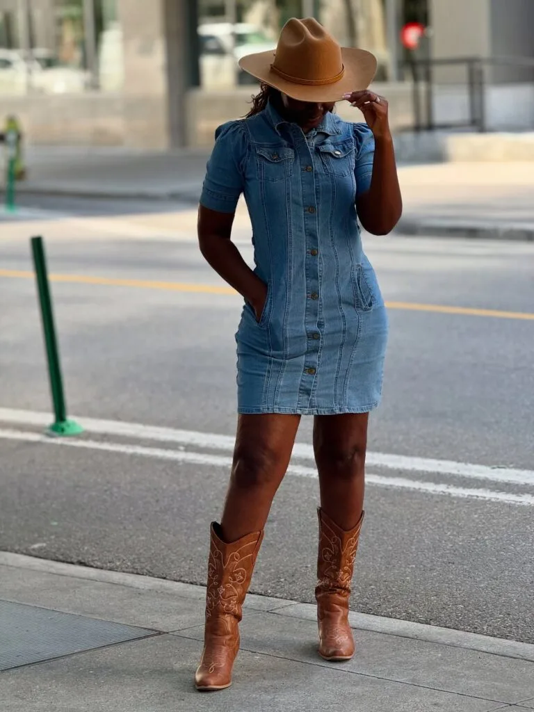 This look combines classic cowgirl charm with city-ready polish. The button-down denim dress features a tailored fit with subtle puff sleeves and front pockets, offering structure and femininity in one sleek piece.